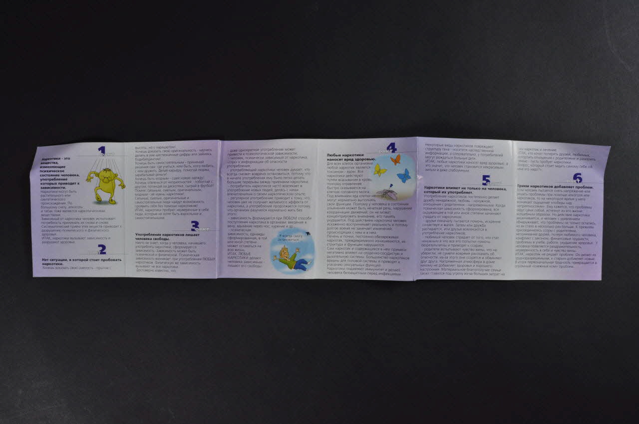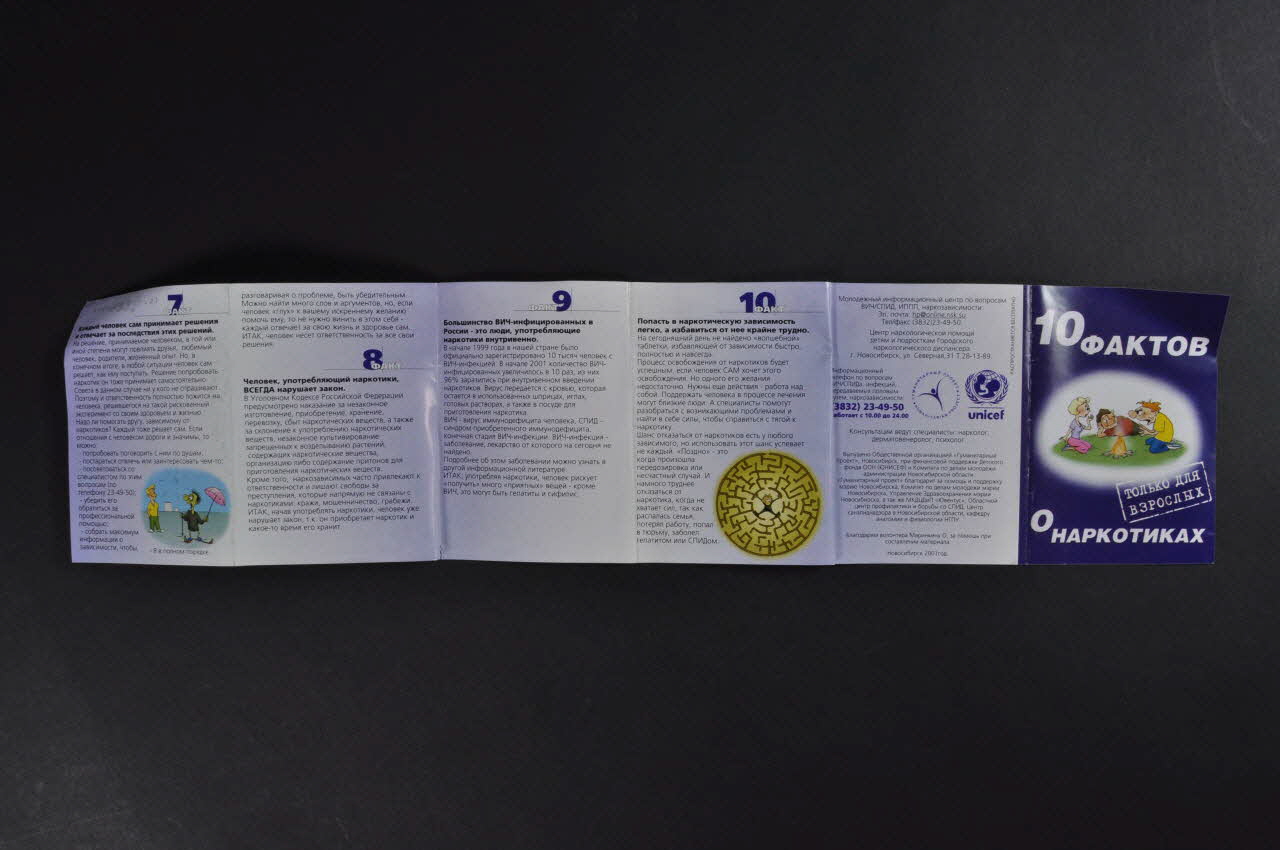 La couverture du dépliant présente, sur un fond violet, au centre, dans un ovale blanc, le dessin de trois jeunes, deux garçons et une fille discutant autour d'un feu de camp. Le dessin est en couleur, effectué dans un style BD. Au dessus et au dessous, on trouve en caractères cyrilliques blancs, et en russe, une inscription.