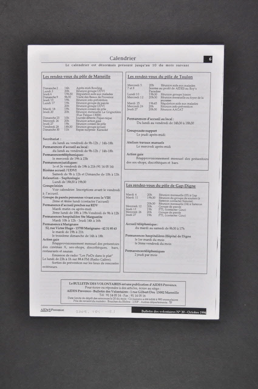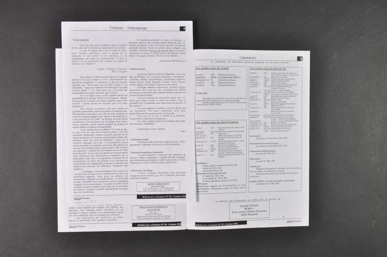 - Editorial // - Vie associative : Comité // - Vie associative : Marseille // - Vie associative : Aix // - Tribune - Témoignages // - Calendrier (dans l'encadré situé sur la gauche), rectoNuméro, date