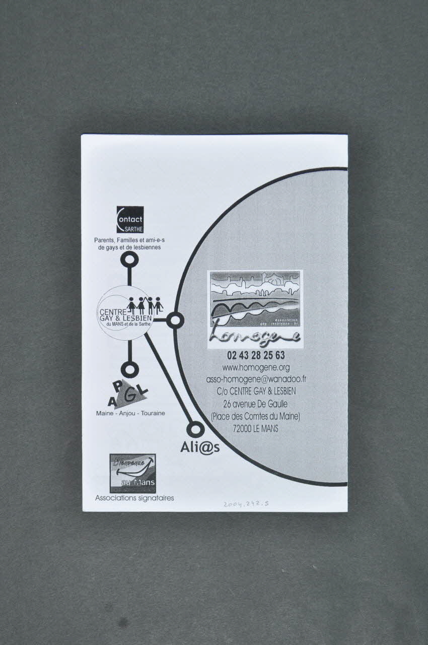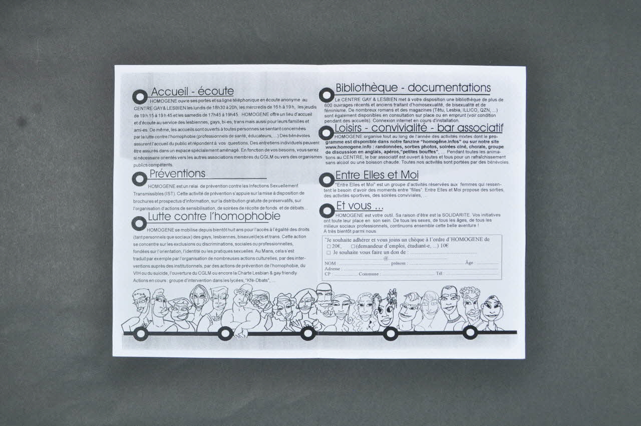 La couverture porte un sommaire sur un fond gris résumé l'action de l'association Homogène au sein de la communauté lesbienne, gaie, bie et trans. Les deux pages intérieures développent les thèmes du sommaire. Elles sont illustrées dans la partie inférieure de dessins représentant des hommes et des femmes dessinés. Sur la page de droite en bas figure un bon d'inscriprion. Au dos figurent en colonne quatre logos associatifs et à droite celui de Homogène sur un fond gris.Inscriptions