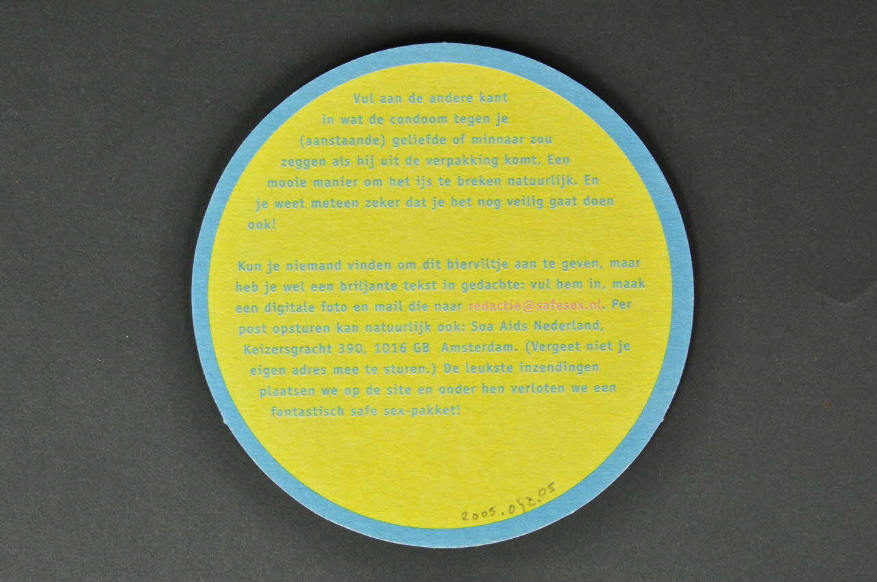 Vul aan de andere kant // in wat de condoom tegen je // (aanstaande) geliefde of minaar zou // zeggen als hij uit de verpakking komt. Een // mooie manier om het ijs te breken natuurlijk. En // je weet meteen zeker dat je het nog veilig gaat doen // ook! // // Kun je niemand vinden om dit bierviltje aan te geven, maar // heb je wel een briljante tekst in gedachte: vul hem in, maak een digitale foto en mail die naar redactie@safesex.nl. Per post opsturen kan natuurlijk ook [] De leukste inzendingen // plaatsen we op de site en onder hen verloten we een // fantastisch safe sex-pakket! (Conditions d'un jeu-concours.), versoDécor