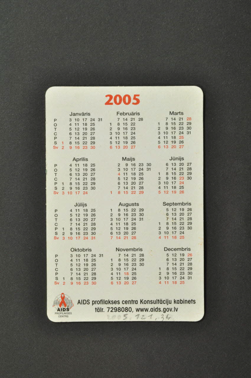 2005 / AIDS profilakses centra Konsultaciju kabinets / talr. 7298080, www.aids.gov.lv (Au verso, sur fond blanc, figure le calendrier imprimé en noir et rouge. On peut y lire par ailleurs, la date, le logo et les coordonnées d'un organisme de lutte contre le HIV.), versoDécor
