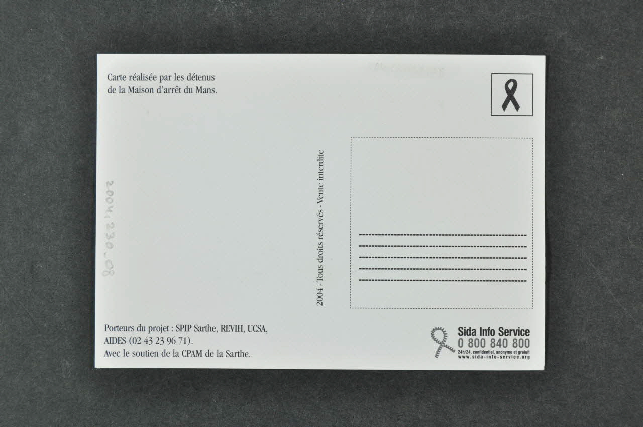 Carte postale réalisée dans le cadre d'un atelier d'expression sur le sida et le 1er décembre à la maison d'arrêt du Mans et vendue à "l'exposition du ruban rouge". (2004.230.05)