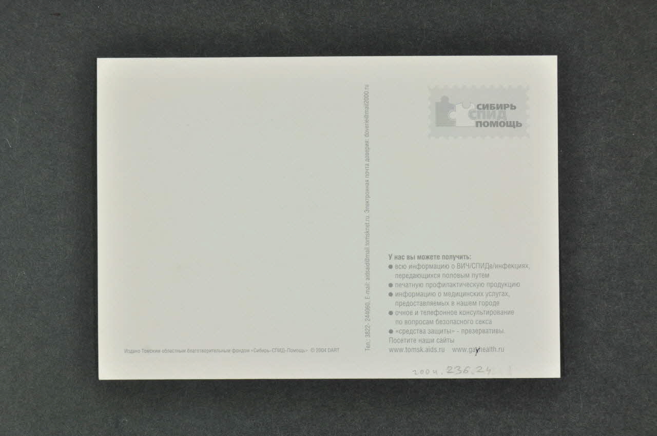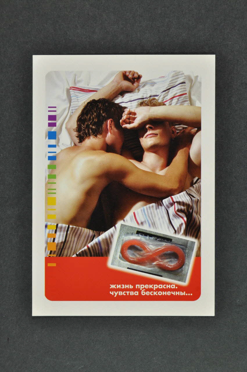 Au recto on peut voir sur fond blanc une photographie couleur d'un couple masculin au lit. En bas dans un ruban rouge il y a une phrase en cyrillique et un préservatif rouge dans son emballage. Le dos est vierge avec un emplacement à droite prévu pour écrire l'adresse du destinataire. En bas, en petit on retrouve à droite un texte en cyrillique et deux adresses internet.Inscriptions