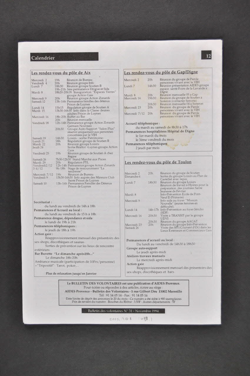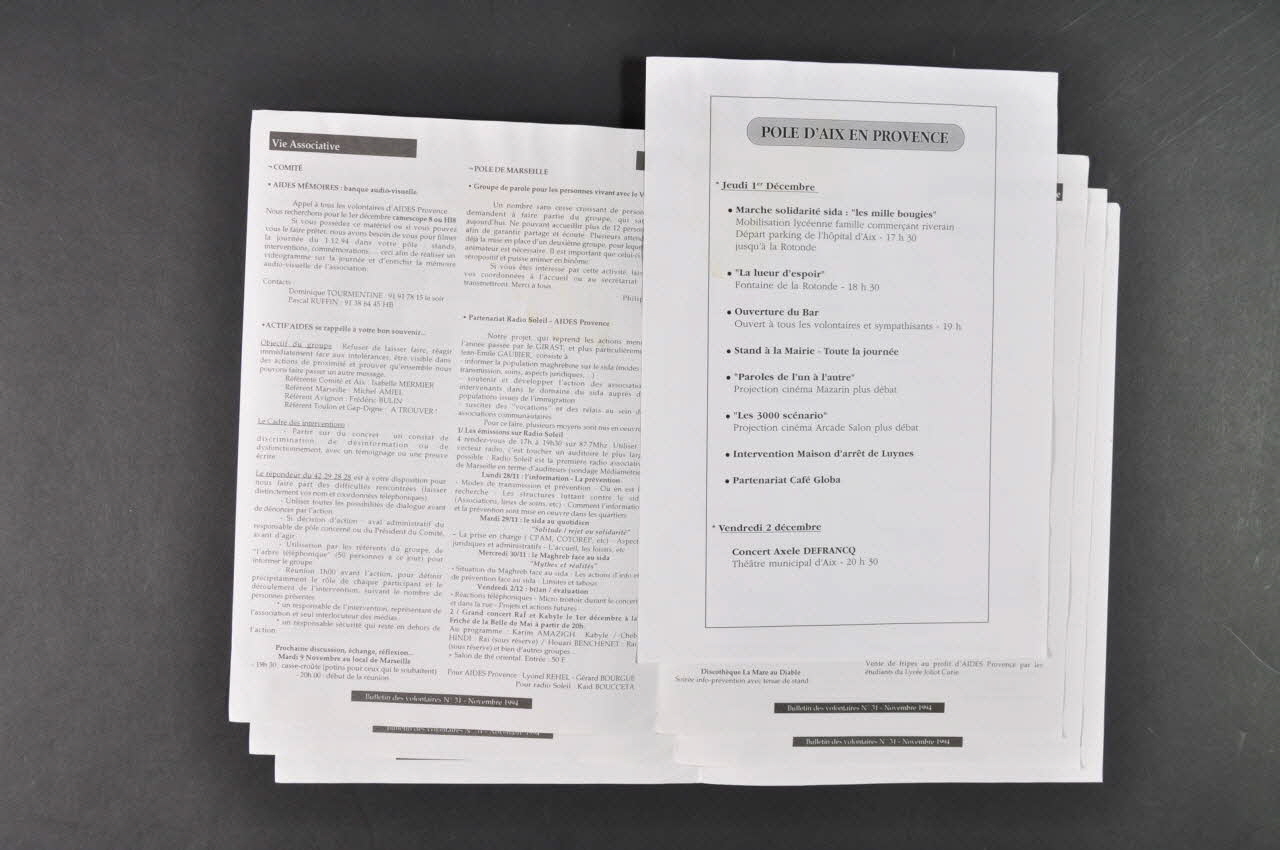 - Vie associative : Comité // - Vie associative : Marseille // -1er décembre 1994 : Journée Mondiale de lutte contre le Sida // - Tribune - Témoignages // - Calendrier (dans l'encadré situé sur la gauche), rectoNuméro, date