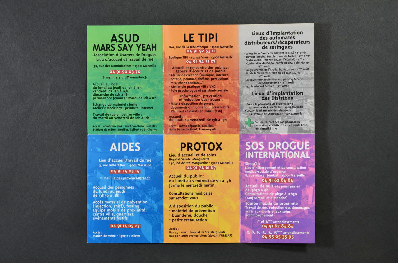 Chaque feuillet est consacré à la présentation d'une ssociation. Les inscriptions sur ces feuillets sont noires et blanches. - ASUD (feuillet vert) - Le Tipi (feuillet orange) - AIDES (feuillet bleu) - Protox (feuillet orange) - SOS Drogues international (feuillet violet) - Lieux d'implantation des automates distributeurs / récupérateurs de seringues / Lieux d'implantation des distribox (feuillet gris) - AMPT Transit (feuillet vert) - Médecins du Monde (feuillet bleu-vert - Autres Regards (feuillet orange)