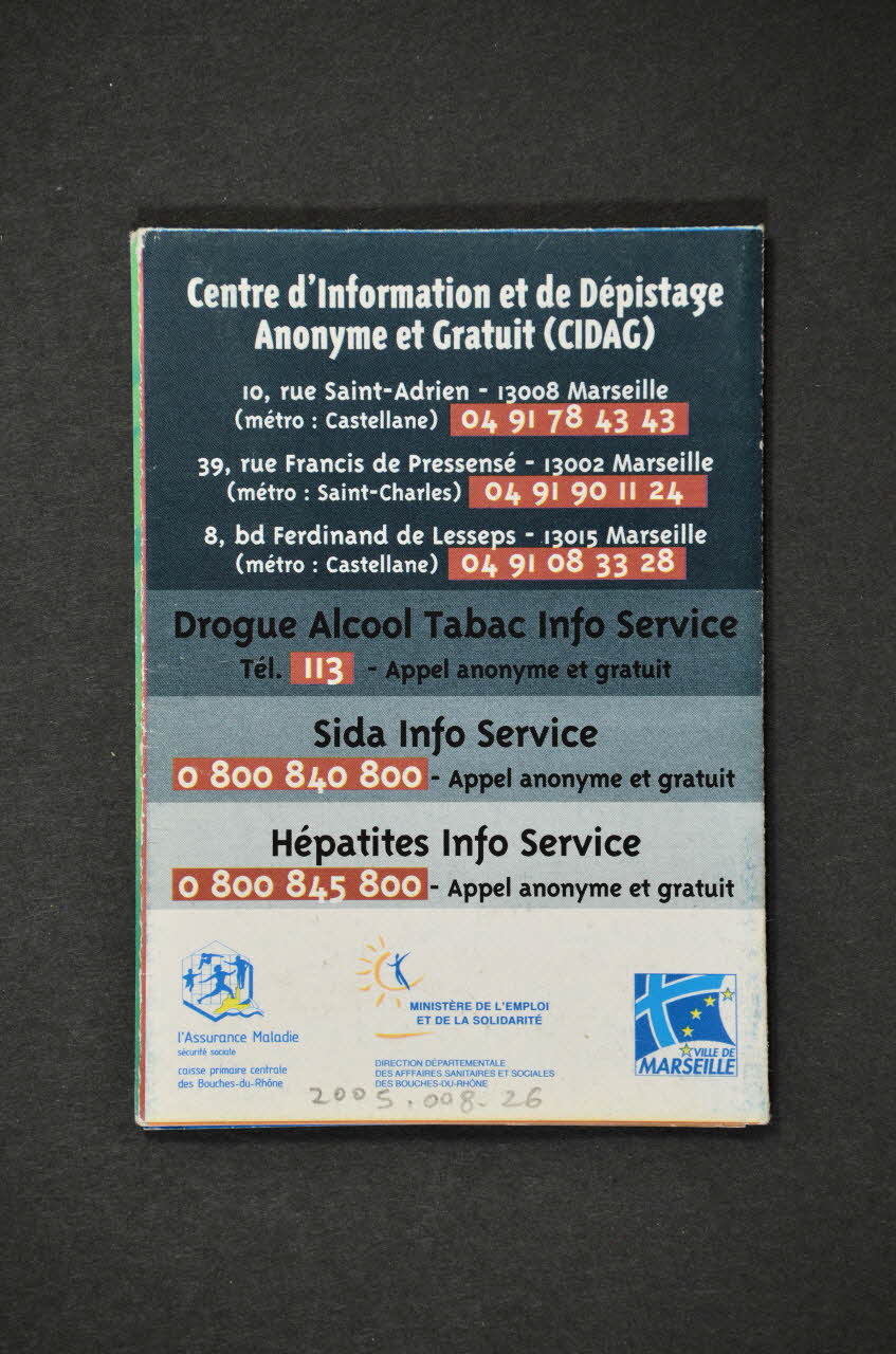 Centre d'Information et de Dépistage // Anonyme et Gratuit (CIDAG) // // 10, Saint-Adrien - 13008 Marseille // (métro : Castellane) // // 39,rue Francis de Pressensé- 13002 Marseille // (métro : Saint- Charles) // // 8, bd Ferdinand de Lesseps - 13015 Marseille // (métro : Castellane) (En blanc sur le côté supérieur.), versoSous-titre