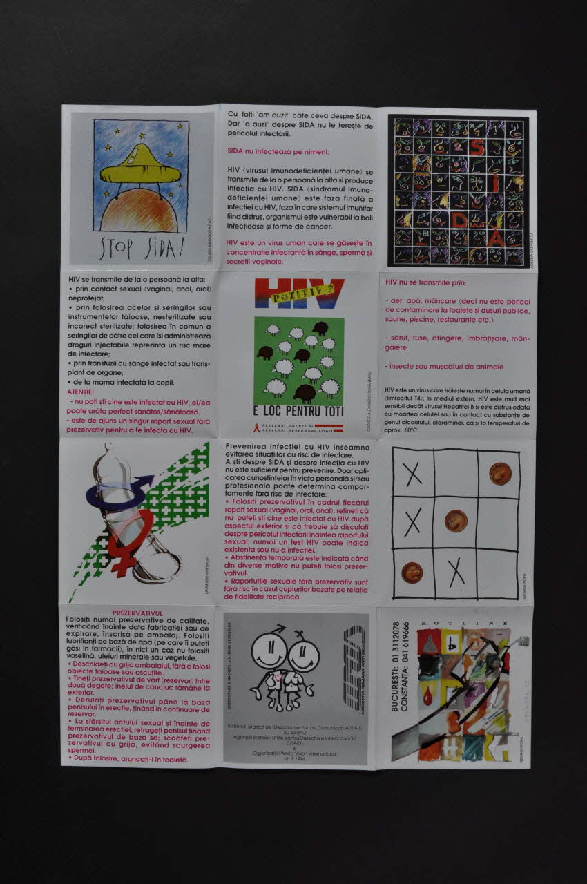 Au revers, chaque carré formé par les pliures est idépendants des autres. Celui-ci en haut à droite sert de couverture au dépliant. Un dessin représentant une capote "soucoupe volante" se déposant sur un demi cercle orange sur un ciel étoilé. Dessous est inscrit le titre en noir. Sur le carré en haut à droite, on retrouve l'affiche reproduite en petit. Au milieu, un dessin de moutons blancs et noirs sur fond vert avec une inscription en rouge, bleu et jaune au dessus,en dessous une inscription noire avec le ruban rouge. Le dessin est signé George Alexandru i Tohaneanu. Au milieu gauche, un préservatif est dessiné avec les symboles de la femme et de l'homme sur une bande verte avec en blanc des "+" et des "-"signé Laurentiu Gherasim. Au milieu droite, un jeu morpion est dessiné avec des capotes par George Poca. En bas au centre, le dessin d'un couple est dessiné sur un fond gris avec des inscriptions en noir dont la mention du soutien financier de USAID et de World Vision International Juillet 1996. En bas, à droite, une affiche est reproduite en couleurs. Un quadrillage avec des cases en couleurs et des lettres est accompagné de numéros de téléphone.