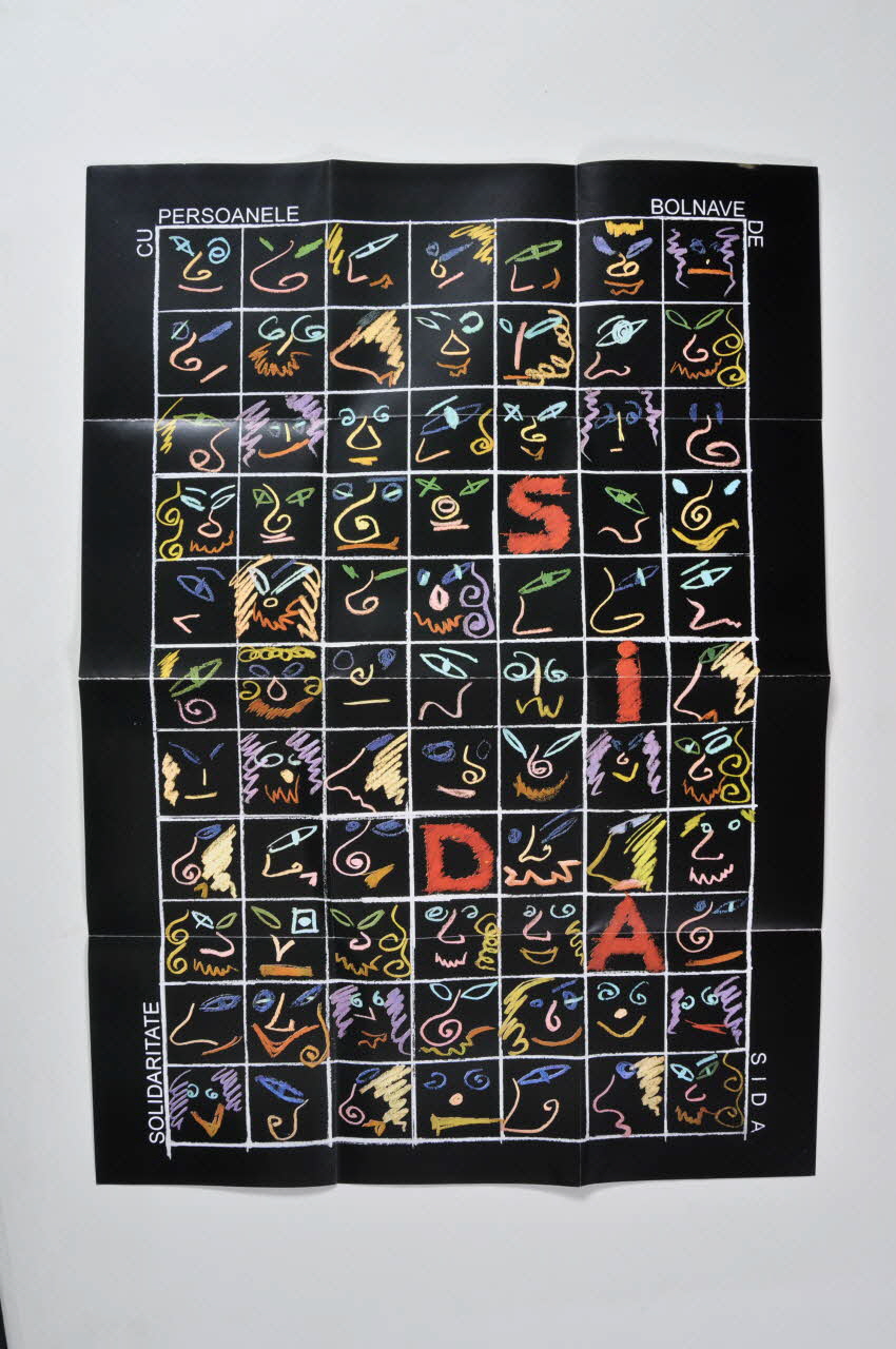 Affiche-dépliant en papier glacé blanc de forme rectangulaire, plié cinq fois. L'affiche représente sur fond noir un quadrillage blanc avec des dessins de visages en couleurs et les lettres "SIDA". Les mots sont inscrits en blanc à chaque coin de la grille: "Solidaritate", "Cu persoanele", "Bolnave de" et "Sida"