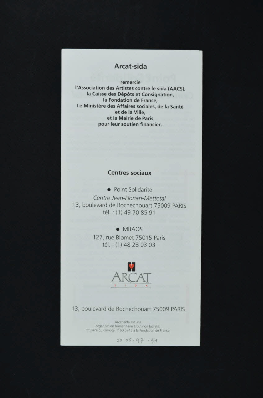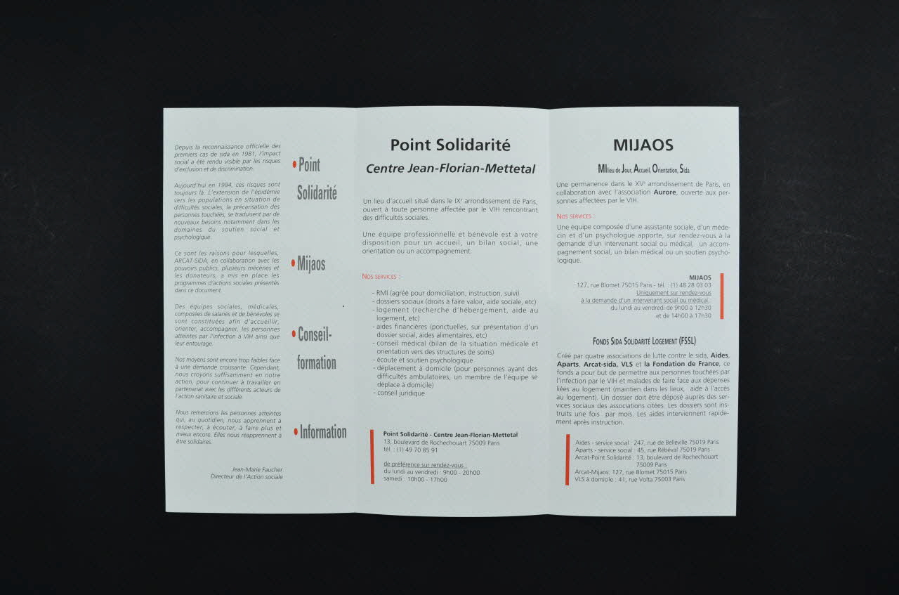 Jean-Marie Faucher, directeur de l'Action Sociale. Editorial. // // // Point Solidarité. // Centre Jean-Florian Mettetal // // // MIJAOS // Milieu de Jour, Accueil, Orientation, Sida // Fonds Sida Solidarité Logement // // Conseil et formation // Le conseil aux professionnels et aux institutions // La formation // Le PAAS (personnel de l'Armée du Salut) contre le sida // // Information // Les fiches techniques du Journal du sida // L'intervention sociale face au sida // // Arcat-sida // remercie // // Centres sociaux, à l'intérieurLogo