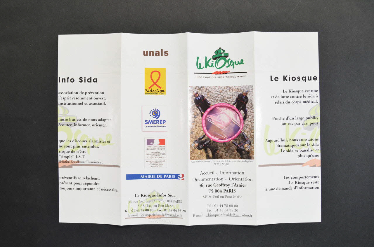 Le Kiosque // Informations Sida Toxicomanie (en haut de la couverture), sur la couverture- unals // - Sidaction // Ensemble contre le Sida // - SMEREP // La mutuelle étudiante // - Ministère des affaires sociales, du travail et de la solidarité // Ministère de la santé, de la famille et des personnes handicapées // - MAIRIE DE PARIS (cinq logos de partenaires au dos du dépliant), versoSommaire