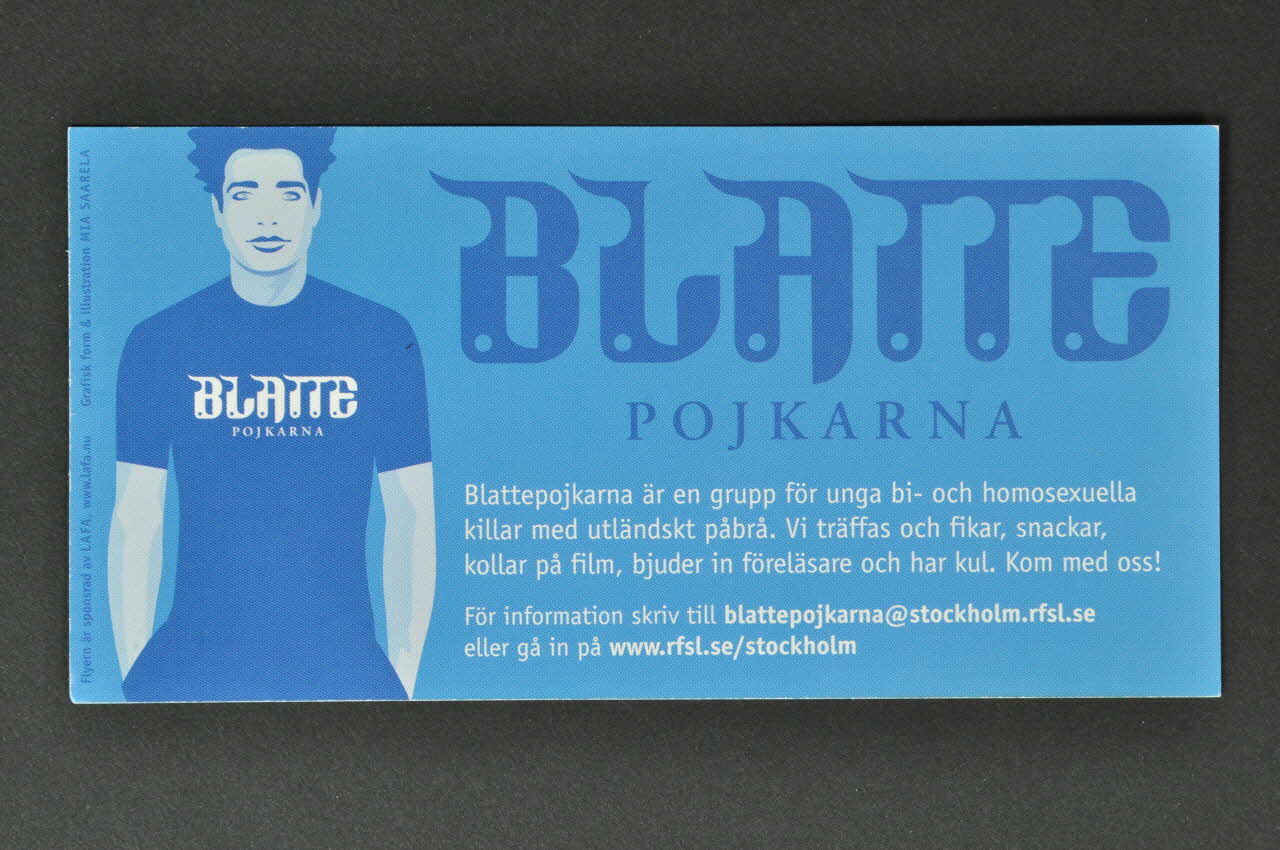 Blatteflickorna är en grupp för unga bi- och homosexuella tjejer med utländsktpåbrå. Vi träffas och fikar, snackar, kollar på film, bjuder in föreläsare och har kul. Kom med oss ! (Paragraphe décrivant l'activité du groupe de discussion. Quasiment identique des deux côtés : un côté adressé aux femmes, l'autre aux hommes.)Décor