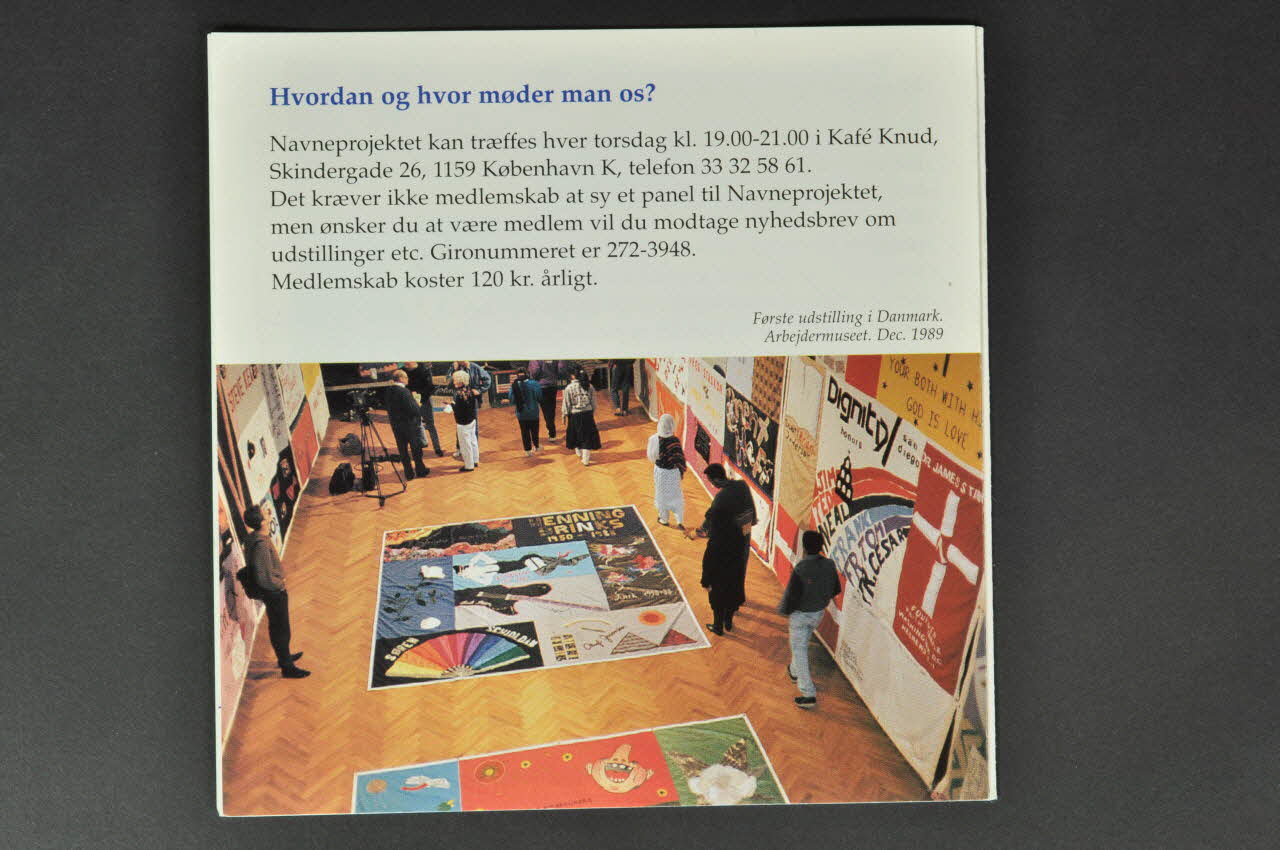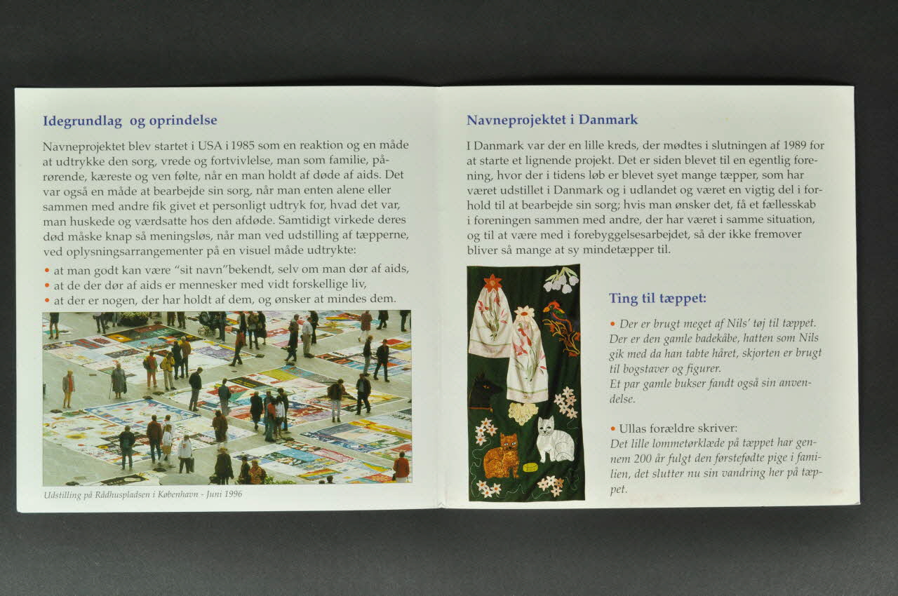 - Feuillet 1 : "Idegrundlag og oprindelse". Illustration : photo d'un déploiement à Copenhague en juin 1996. // - Feuillet 2 : "Navneprojektet i Danmark" (Le projet des noms au Danemark) / "Ying til taeppet" (citations de lettres ?). Illustration : photo d'un carré. // - Feuillet 3 : Photo du carré n°6 // - Feuillet 4 : "Hvordan laver man et mindetaeppe" . Illustration : plan d'assemblage de panneaux et femme cousant // - Feuillets 5 et 6 : "Med udstillingen af taepperne" . Extraits de lettres (vérifier) Photos de 4 panneaux, d'un enfant regardant avec son père un panneau affiché à un mur, d'un atelier assemblant des panneaux. (au fil des pages)Sous-titre, adresse