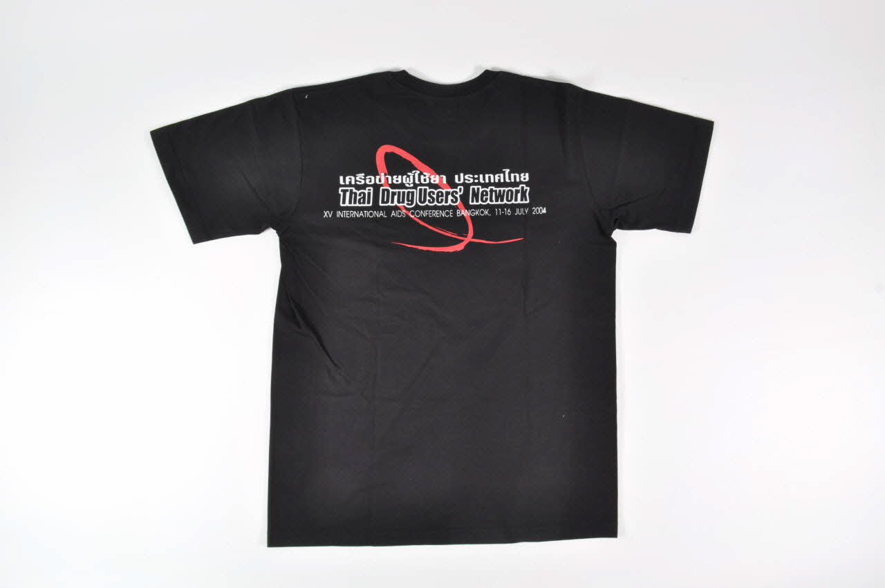 Clean Needles, / Methadone, / AIDS Treatment / for Drug Uses Now! / NO MORE DRUG WAR (Sur l'avant.)Thai Drug Users' Network / XV INTERNATIONAL AIDS CONFERENCE BAGKOK, 11-16 July 2004 (Dans le dos.)Décor