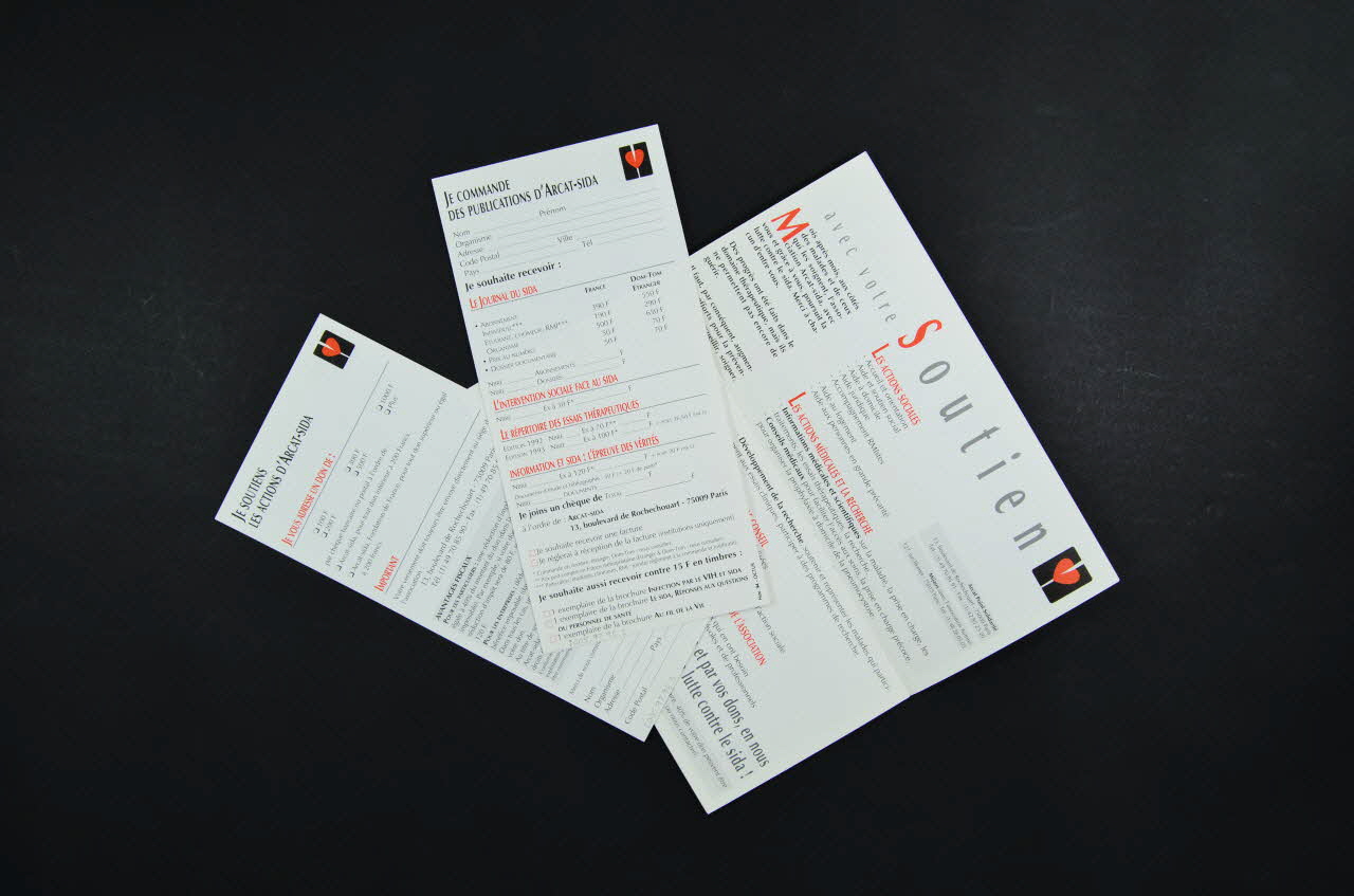 Sur la couverture se trouve un logo composé d'un coeur rouge fendu dans un rectangle noir au dessus d'inscriptions grises et rouges. On retrouve le même logo au dos en plus petit accompagné d'inscriptions rouges et noires. A l'intérieur, le motif du logo est repris pour illustrer le texte imprimé en noir, gris et rouge. Les couvertures de livres et de revues sont reproduites en noir et blanc. .2 : De forme rectangulaire, le bon de commande en papier blanc se lit horizontalement au recto et verticalement au verso. Au recto, le coin supérieur droit est occupé par le coeur dans le rectangle noir. Des inscriptions noires y figurent également. Au verso, le même motif se trouve en haut à droite. Sur le reste de la page apparaissent des inscriptions noires et rouges. .3 : De forme rectangulaire, le bulletin de don en papier blanc se lit horizontalement au recto et verticalement au verso. Au recto, le coin supérieur droit est occupé par le coeur dans le rectangle noir. Des inscriptions noires y figurent également. Au verso, le même motif se trouve en haut à droite. Sur le reste de la page apparaissent des inscriptions noires et rouges. Certaines inscriptions noires sont placées dans un rectangle gris clair.Inscriptions