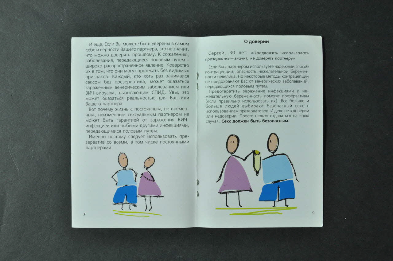 Elle est imprimée en couleur et est écrite en cyrillique. Au recto, le dessin représente deux silhouettes de jeunes, un garçon et une fille, habillés en bleu et violet. Ils tiennent un ballon jaune en forme de préservatif qu'ils font voler dans le ciel. En haut, se situent les logos de la Croix rouge et de l'Unicef. En bas, en caractères cyrillliques noirs, est inscrit le titre. A l'intérieur, le texte est en caractères cyrilliques noirs, sur fond blanc. Les titres des chapitres sont en rouge. Les vignettes représentent les mêmes silhouettes. Sur l'une c'est la fille qui tend le préservatif au garçon. Au verso, le fond est blanc. Le texte est en petits caractères cyrilliques noirs. Un petit dessin représente les mêmes personnages assis sur un polochon en forme de préservatif, enlacés.Décor
