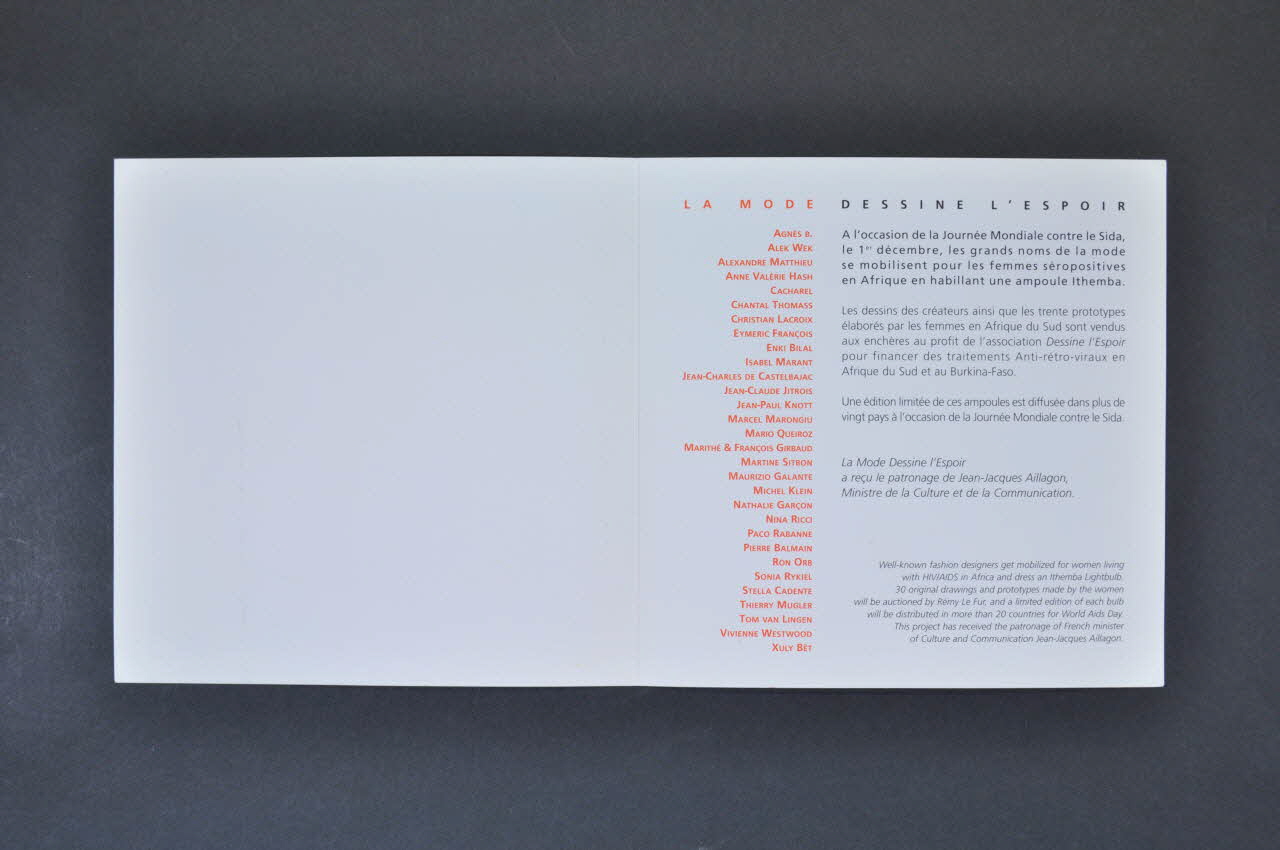 A l'occasion de la Journée Mondiale contre le Sida, le 1er décembre, les grands noms de la mode se mobilisent pour les femmes séropositives en Afrique en habillant une ampoule Ithemba. // Les dessins des créateurs ainsi que les trente prototypes élaborés par les femmes en Afrique du sud sont vendus aux enchères au profit de l'association Dessine l'Espoir pour financer des traitements anti rétro viraux en Afrique du Sud et au Burkina Faso. // Une édition limitée de ces ampoules est diffiusée dans plus de vingt pays à l'occasion de la Journée Mondiale contre le Sida. // La Mode Dessine l'Espoir a reçu le patronage de Jean-Jacques Alliagon, Ministre de la Culture et de la Comminication. (page de droite), à l'intérieurDécor