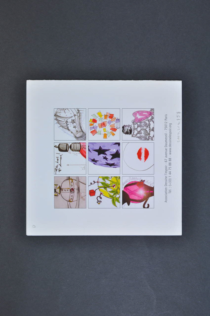 La couverture est illustrée de neuf petits carrés formant un grand carré. Celui du centre est rouge avec un ruban blanc, les huit autres sont des photographies sur fond noir d'ampoules décorées allumées. Le nom du projet figure en bas en noir. L'arrière reprend la même composition avec neuf détails de dessins préparatoires d'ampoules, et les coordonnées de l'association en partie inférieure. La page intérieure gauche est vierge. Celle de droite comporte un texte en noir et à gauche une liste de noms en rouge.Inscriptions