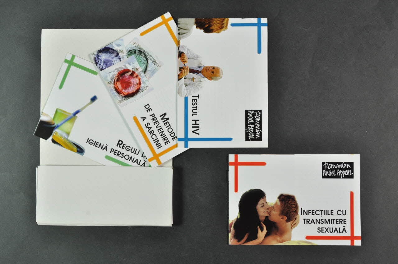 La pochette est blanche et de forme rectangulaire. Le recto présente quatre vignettes, chacune ayant un illustration diverse: Une avec les bandes jaunes croisées montre des préservatifs emballés; une avec les bandes vertes croisées montre des accessoires des toilette comme une brosse à dents, savon...; une avec les bandes bleues croisées présente un médecin et un patient assis et une avec les bandes rouges croisées avec un couple allongé, enlacé.