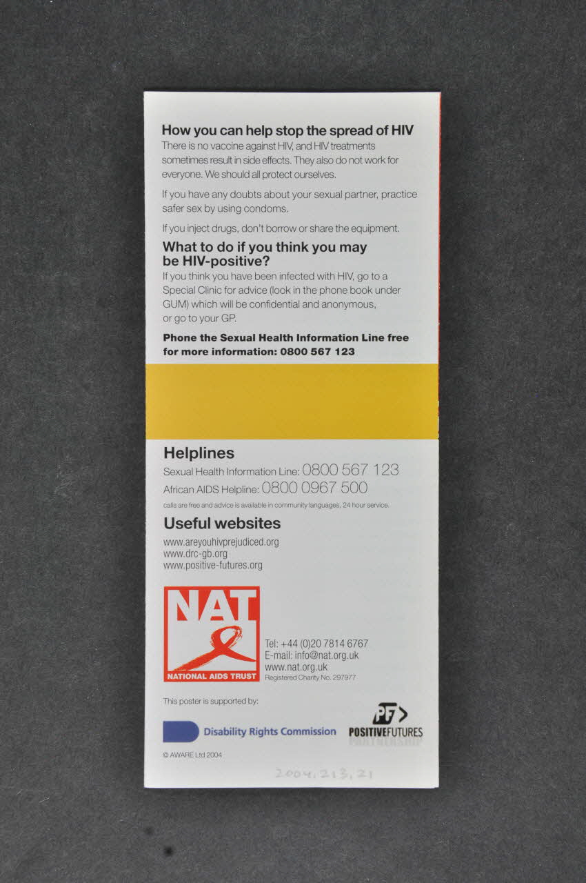 - NATIONAL AIDS TRUST // - Disability Rights Commission // - POSITIVE FUTURES (trois logos en bas du dos du dépliant), versoSous-titre