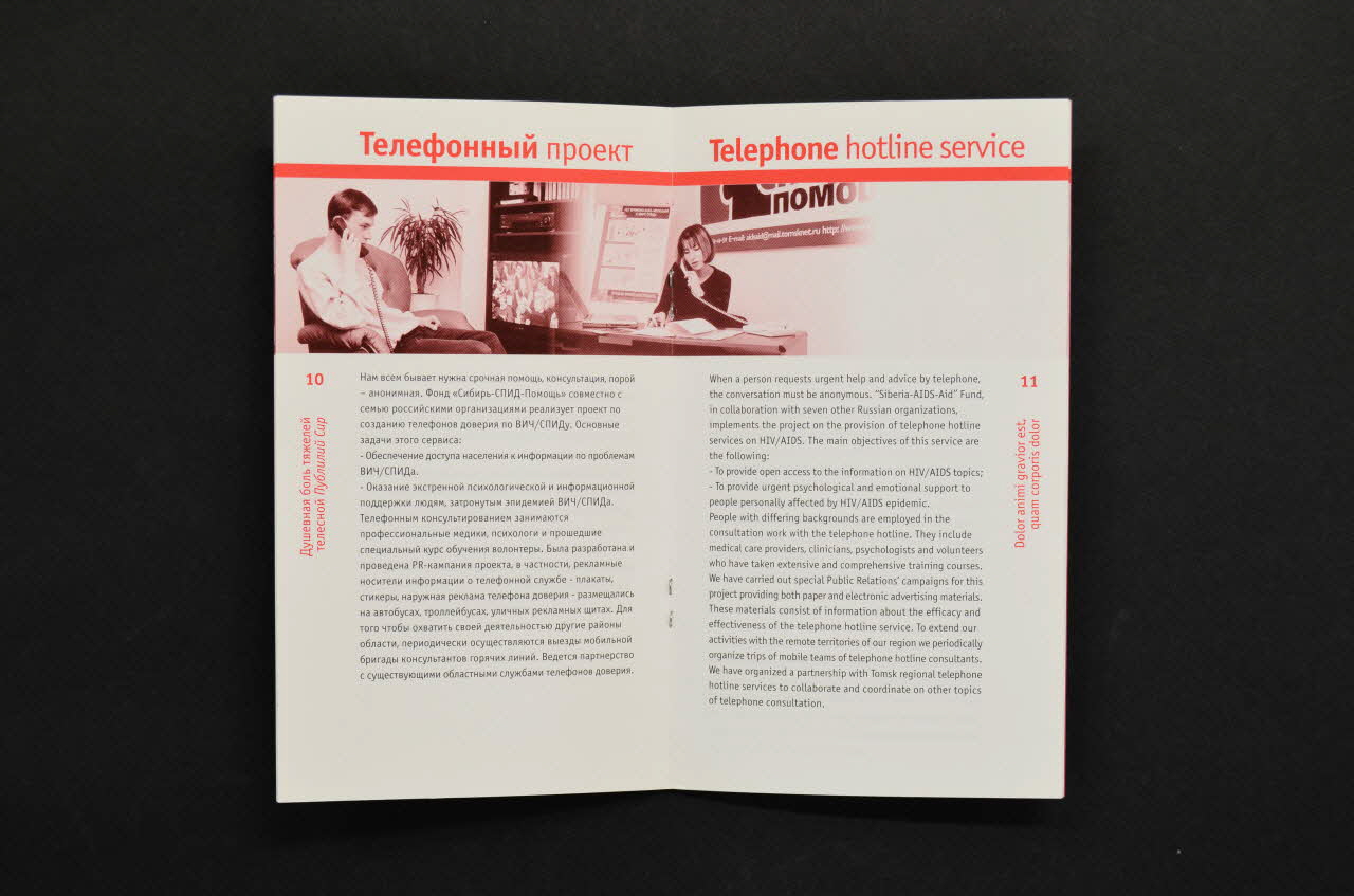 [...] // Here we are // 2 [...] / Our history // 4 [...] / Our command // 6 [...] / Youth // 8 [...] / Professionals // 10 [...] / Telephone hotline service // 12 [...] / // Sex-workers and their clients // 14 [...] / // Siberian network of people living with HIV/AIDS // 16 [...]/ Internet // 18 [...] / Our partners (en face du deuxième de couverture), à l'intérieurDécor