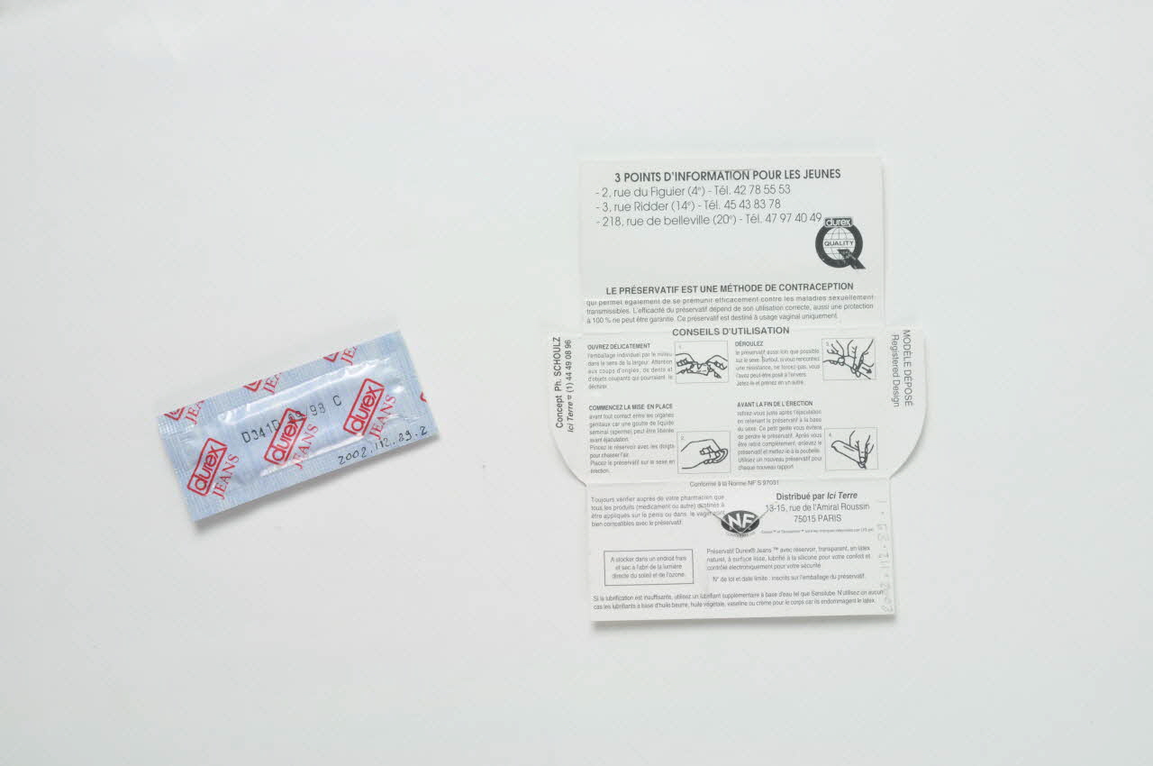 "3 points d'information pour les jeunes (rue du Figuier, rue Ridder, rue de Belleville. // Logo de Durex Quality // Le préservatif est une méthode de contraception qui permet également de se prémunir contre les maladies sexuellement transmissibles. L'efficacité du préservatif dépend de son utilisation correcte, aussi, une protection à 100% ne peut être garantie . Ce préservatif est destiné à usage vaginal uniquement. // Deuxième rabat // "Vous désires vous renseigner sur : // - ce qu'est le sida, // - les méthodes de prévention, // - le dépistage, // - les soins // - les services et adresses utiles. // Interrogez 24H/24 le répondeur-interactif de la Mairie de Paris. // Info Sida 45 67 01 01 ((Numéro qui se voit aussi à l'extérieur de la pochette) // // A l'intérieur de l'étui, imprimé en petits caractères noirs avec 4 schémas: // "Conseils d'utilisation // 1 Ouvrez délicatement l'emballage individuel par le milieu, dans le sens de la largeur. Attention aux coups d'ongles, de dents et d'objets coupants qui pourraient le déchirer. // 2. Commencez la mise en place avant tout contact entre les organes génitaux car une goutte de liquide séminal ou de sperme peut être libérée avant éjaculation. Pincez le réservoir avec les doigts pour chasser l'air. Placez le préservatif sur le sexe en érection. // 3. Déroulez le préservatif aussi loin que possible sur le sexe. Surtout, si vous rencontrez une résistance, ne forcez pas, vous l'avez peut-être posé à l'envers. Jetez le et prenez-en un autre. // 4. Avant la fin de l'érection, retirez-vous juste après l'éjaculation en retenant le préservatif à la base du sexe. Ce petit geste vous évitera de perdre le préservatif. Après vous être retiré complètement, enlevez le préservatif, nouez le et mettez-le à la poubelle. Utiisez un nouveau préservatif pour chaque nouveau rapport. // Au dos de l'autre rabat : // "Toujours vérifier auprès de votre pharmacien que tous les produits (médicaments ou autre) destinés à être appliqués sur le pénis ou dans le vagin sont bien compatibles avec le préservatif. // Norme NF (logo) // Distribué par Ici Terre (coordonnées à Paris) // A stocker dans un endroit frais et sec à l'abri de la lumière directe du soleil et de l'ozone. // Préservatif Durex Jeans, avec réservoir, transparent, en latex naturel, à surface lisse, lubrifié à la silicone pour votre confort et contrôlé électroniquement pour votre sécurité.. // N° de lot et date limite inscrits sur l'emballage du préservatif. // Si la lubrification est insuffisante, utilisez un lubrifiant supplémentaire à base d'eau tel que Sensilube. N'utilisez en aucun cas les lubrifiants à base d'huile, beurre, huile végétale, vaseline ou crème pour le corps car ils endommagent le latex., à l'intérieur