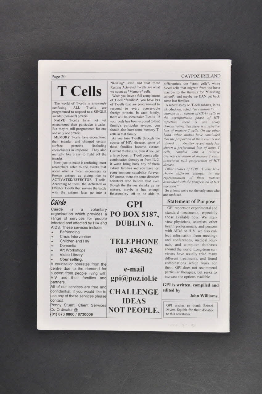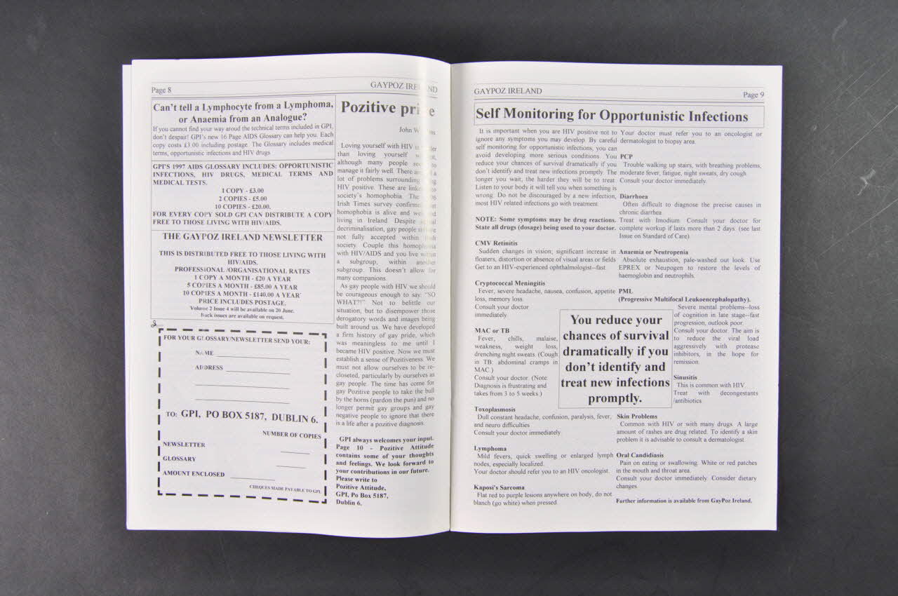 GAYPOZ IRELAND MAY 1996 - MAY 1997 // // DEPRESSION & HIV // // NEVIRAPINE, NELFINAVIR, DIDANOSINE // // CONFIDENTIALITY ? // // SELF MONITORING FOR OPPORTUNISTIC INFECTIONS // // UNPROTECTED SEX AMONG HIV-POSITIVES // // FOOD FOR THOUGHT // // VIRAL LOAD TESTING // // CANDIDA // // PHENOTYPE TESTING // // HIV ADULT STANDARD OF CARE WITH A CD4 COUNT BETWEEN 500 AND 200 // // BEYOND THE PROTEASE INHIBITOR // // QUESTIONS TO ASK ABOUT ANTIRETROVIRAL THERAPY // // T - CELLS (contenu de la revue, pas nécessairement dans l'ordre de la présentation du numéro), sur la couvertureDécor