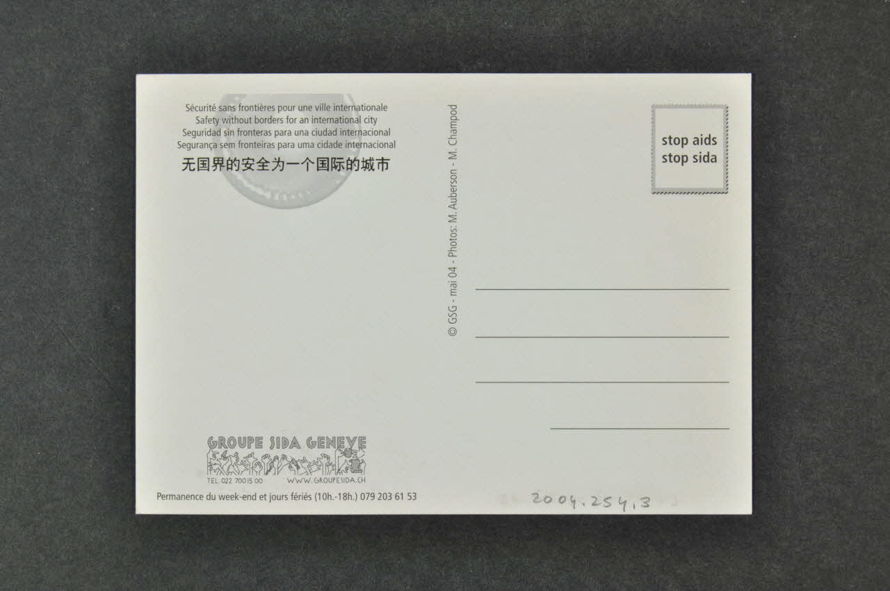 Au recto, la carte est divisée en quatre vignettes représentant des photos touristiques, caractéristiques de la ville de Genève. En surimpression, au centre, un cercle blanc relie huit petits préservatifs. En bas, à gauche, en capitales jaunes, se trouve une inscription.