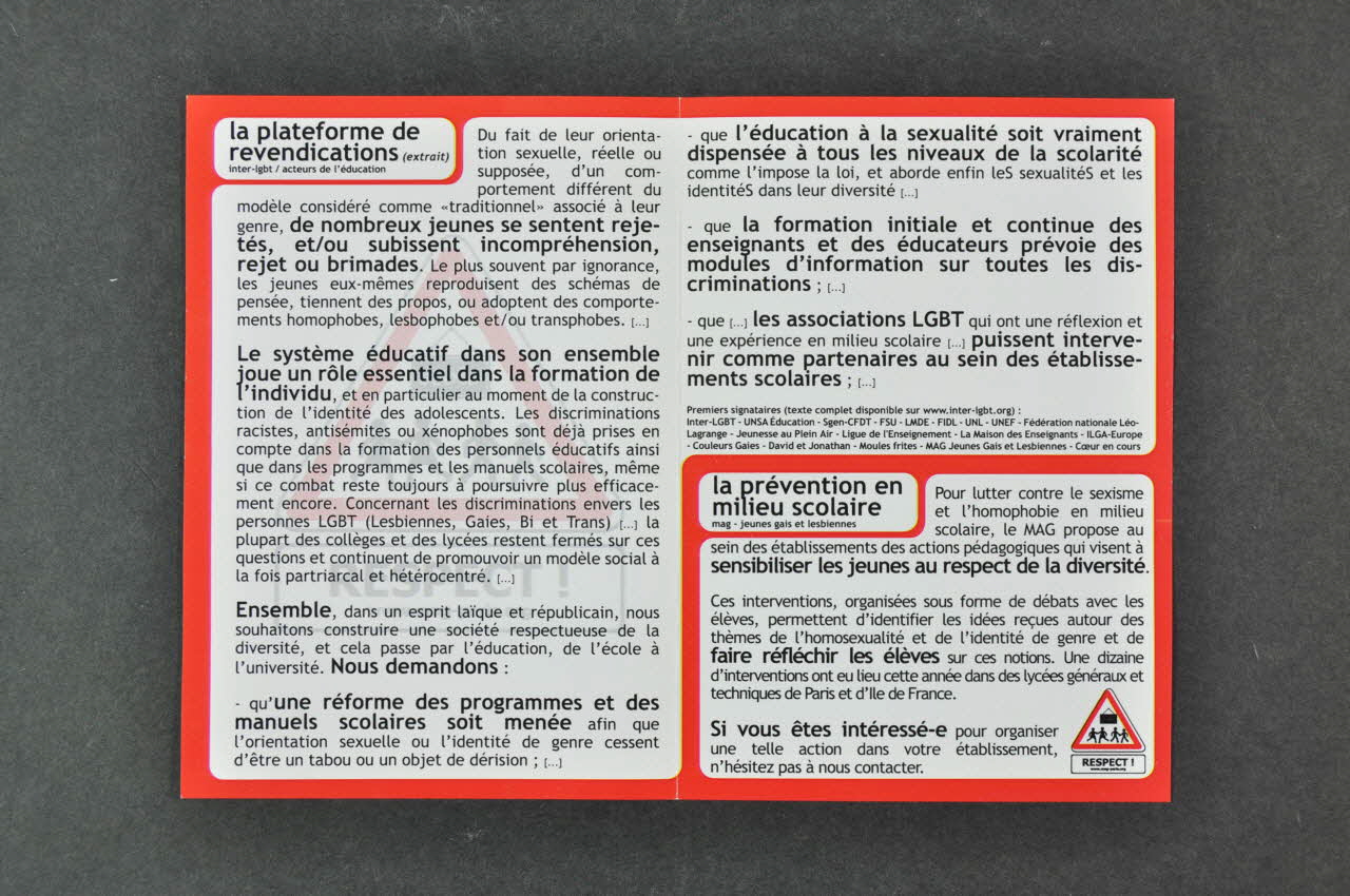 Le recto présente une illustration graphique montrant un panneau de signalisation triangulaire blanc et rouge, au milieu de celui-ci figurent des enfants schématisés et un écriteau noir avec une inscription. En-dessous, se trouve une languette blanche contenant une inscription noire. Au verso, cinq languettes blanches sont imprimées sur fond rouge et comportent des inscriptions en caractères noirs. A l'intérieur, le texte est inséré dans quatre languettes blanches.Inscriptions