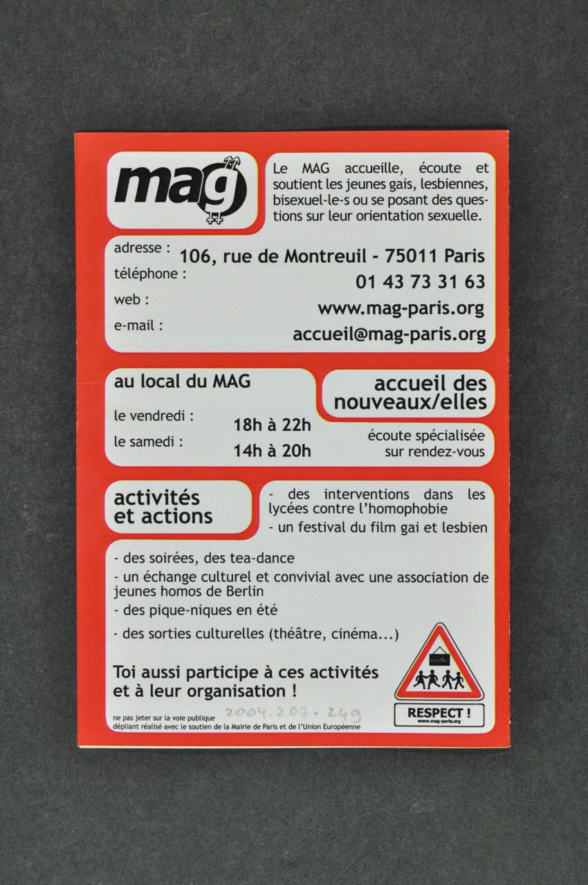 mag // Le MAG accueille, écoute et soutient les jeunes gais,lesbiennes, // bisexuel-le-s ou se posant des questions sur leur orientation sexuelle. // adresse: 106, rue de Montreuil - 75011 Paris // téléphone: 01 43 73 31 63 // web: www.mag-paris.org // e-mail: accueil@mag-paris.org (L'inscription est marquée dans la partie supérieure du verso. // Le logo est formé de trois lettres dont la dernière est insérée dans un disque noir.), versoDécor