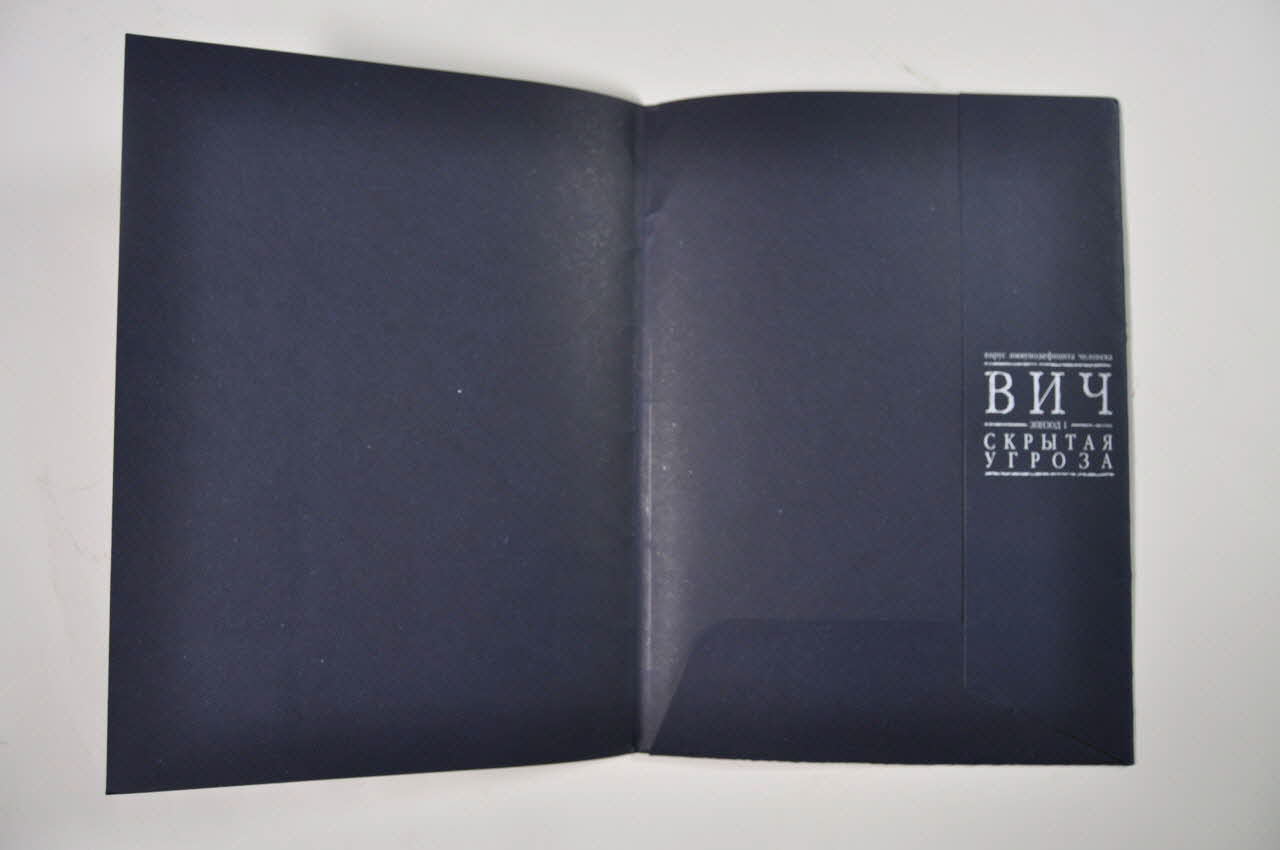 Sur la couverture à fond bleu foncé on trouve au centre des rayures verticales blanches et rouges. Au milieu on a mis un autocollant carré fond bleu nuit représentant une partie de globe bleue et rouge et un soleil rouge (incendie ?). En bas, en capitales cyrilliques blanches il y a le titre en cyrillique. Sur le volet intérieur, on retrouve la même phrase en caractères blancs. Au dos il y a les logos de deux associations et leurs coordonnées.Inscriptions