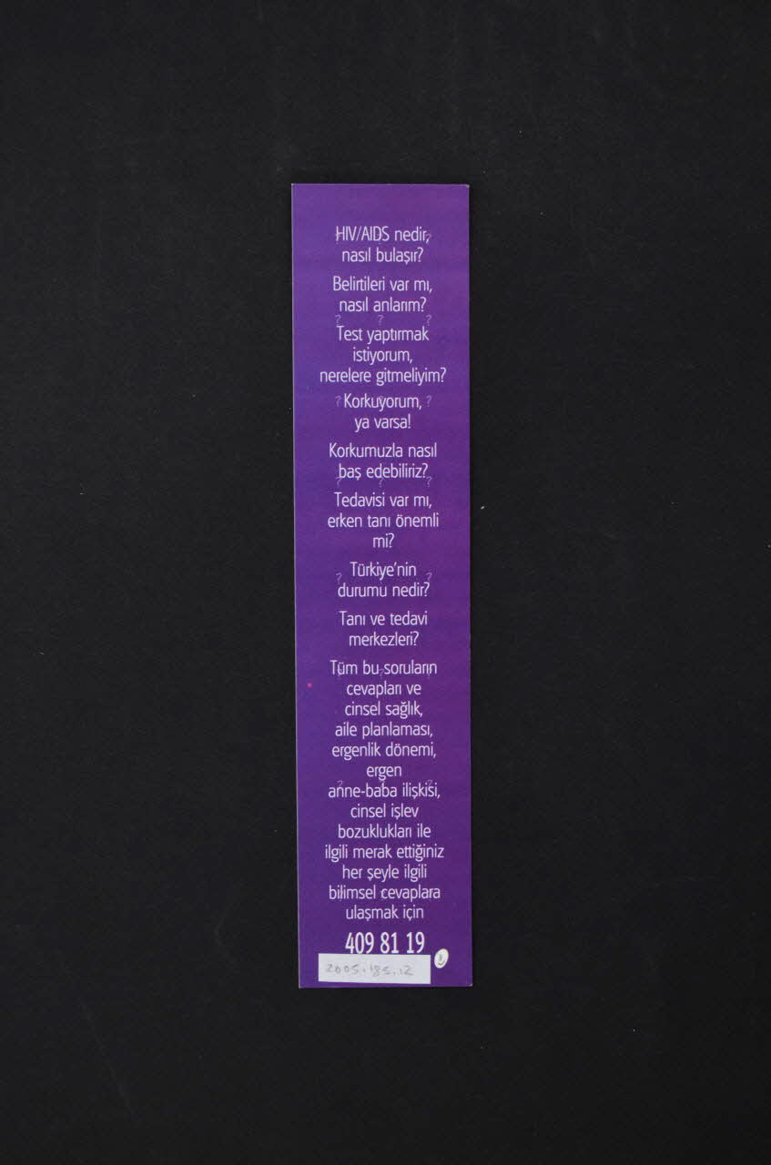 Il s'agit d'un marque page en papier cartonné, imprimé en couleur. Il est de forme rectangulaire et se lit en hauteur. Il est écrit en turc.