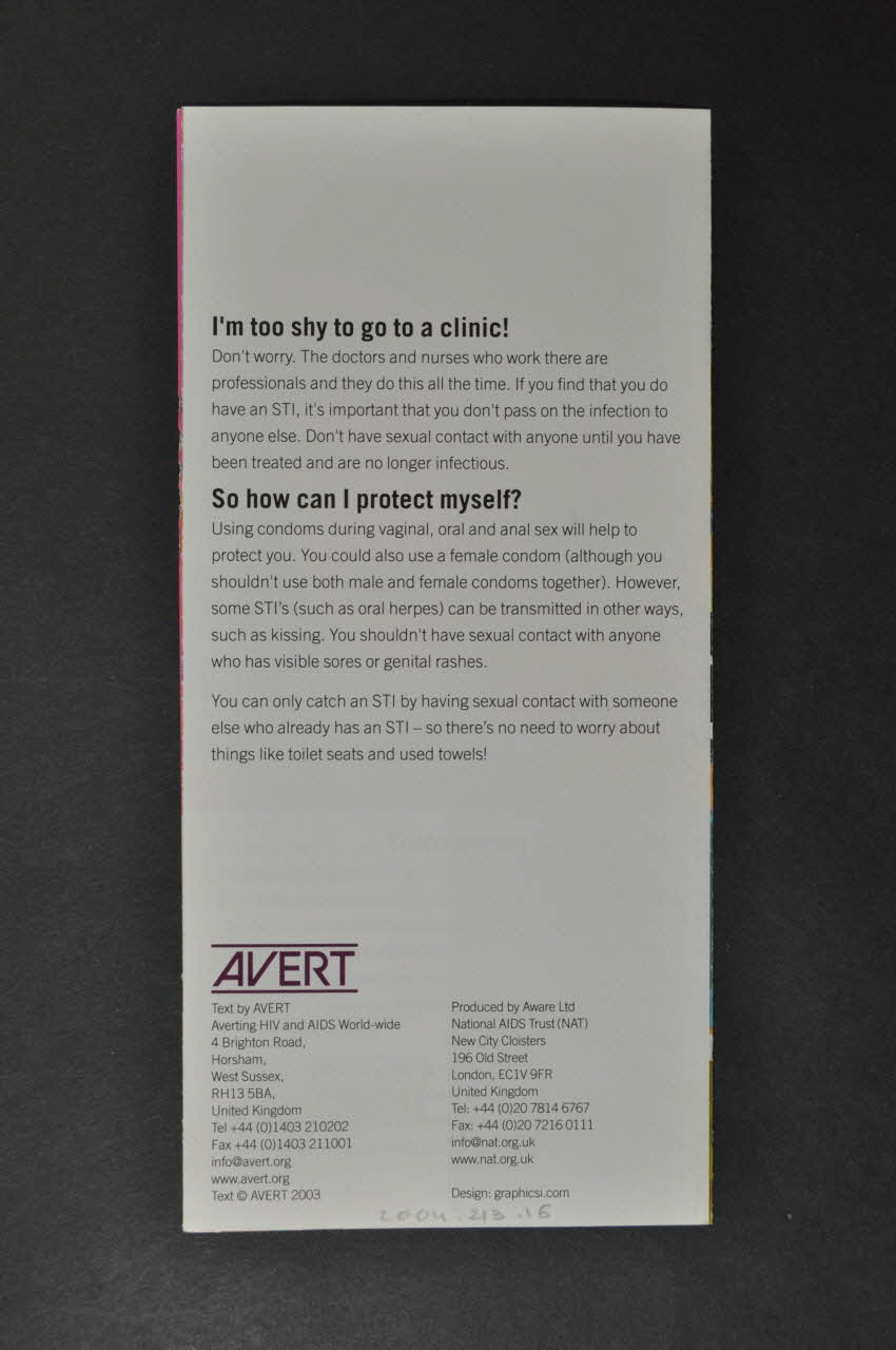 Text by AVERT / Averting HIV and AIDS World-wide / 4 Brighton Road, / West Sussex, / RH13 5BA, / United Kingdom / [...] / Text AVERT 2003 / [...] (En noir, dans la partie inférieure.), versoSous-titre