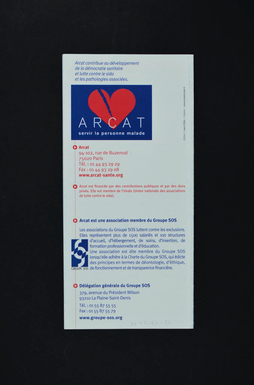 Le social // Accueil et orientation des personnes // Conseil juridique et aide à l'accès aux soins // Logement // Ecoute et soutien psychologique // Conseil médical // Insertion sociale et professionnelle // // La prévention et la formation // Prévention auprès des migrants // Prévention auprès des étudiants et de la communauté gay // Actions en entreprises // Formation // // Le pôle médical // Actions VIH // Actions hépatites // // La communication et l'information // Relations presse // Publications // Le Journal de la Démocratie sanitaire // Site internet // Evénementiel // // Aide aux personnes // Accueil // Soutien // Orientation // Hébergement // // Information // Publications // Formations // Actions de prévention // // Aide à la recherche // Publication régulière d'informations sur les essais thérapeutiques sur le VIH et le VHC // Suivi de l'actualité médicale // // Arcat contribue au développement // de la démocratie sanitaire // et lutte contre le sida // et les pathologies associées. // // Arcat est une association membre du Groupe SOS // // Délégation générale du Groupe SOS (et au dos), à l'intérieurLogo