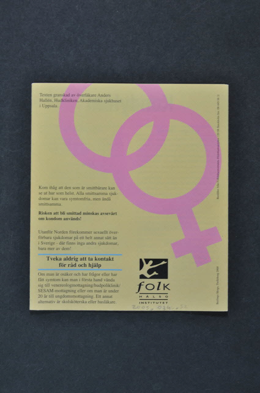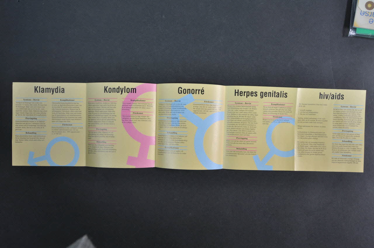 Fakta Om // Sju // sjuk // Domar // Som smittar vid sex (traduire) (Le titre est en grands caractères noirs au recto.), sur la couvertureKlamydia // Kondylom // Gonorré // Herpes genitalis // hiv/aids // Skabb (Les titres sont marqués en noir, un titre par volet.), à l'intérieurLogo, nom de société