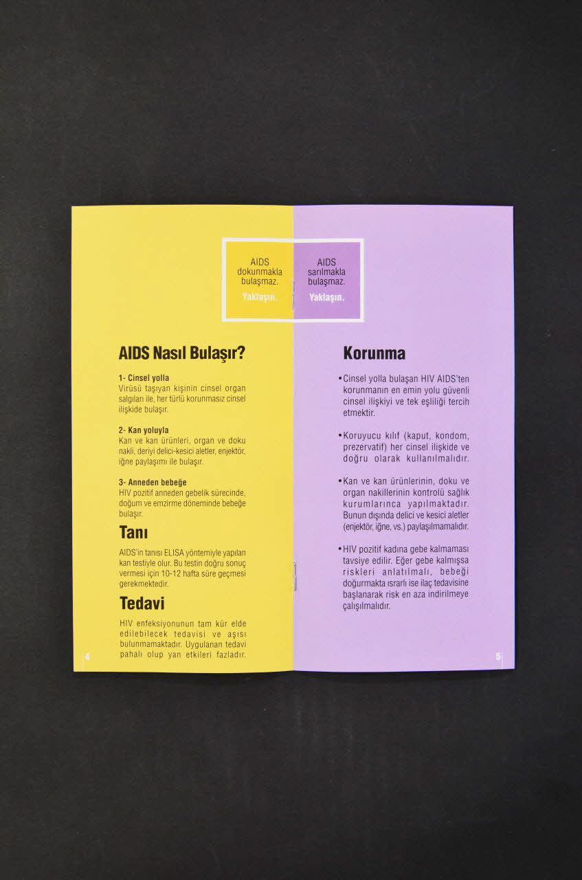 AIDS Nedir? // [...] // AIDS Nasil Bulasir? // [...] // Tani // [...] // Tedavi // [...] // Korunma // [...] // AIDS'in // Bulasmadigi // Durumlar // [...] // Dünyada ve // Türkiye'de AIDS // [...] (Grands titres inscrit en noir sur les différentes pages), à l'intérieurYaklas. (Titre de la brochure inscrit en blanc dans le haut de la page), sur la couvertureTexte