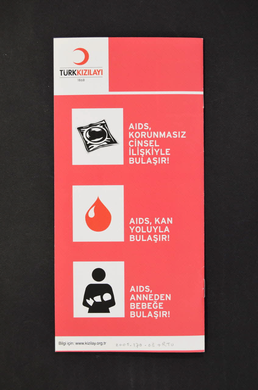 Présentation de la campagne en 2005.170.16. - p.2 Fond blanc, impression en noir. Logo du Croissant rouge avec en dessous, en noir, numéros de téléphone utiles. - p.3 Fond rouge, impression en blanc. Sous titre : AIDS Nedir? - p.4 Fond jaune, impression en noir. En haut, à droite, dans un carré encadré de blanc, en noir : "AIDS dokunmakla bulasmaz" Et, en plus grands caractères blancs : "Yaklasin". En dessous, texte avec trois sous titres : AIDS Nasil Bulasir ?/ Tani / Tedavi - p.5 Fond violet, impression en noir. En haut, à gauche, dans un carré encadré de blanc, en noir : "AIDS sarilmakla bulasmaz" Et, en plus grands caractères blancs : "Yaklasin". En dessous, texte avec comme sous titre : Korunma. - p.6 Fond rose saumon, impression en noir. En haut, à droite, dans un carré encadré de blanc, en noir : "AIDS konusmakla bulasmaz" Et, en plus grands caractères blancs : "Yaklasin". En dessous, texte avec comme sous titre : AIDS' in Bulasmadigi Durumlar. - p.7 Fond bleu, impression en noir. En haut, à gauche, dans un carré encadré de blanc, en noir : "AIDS oynamakla bulasmaz" Et, en plus grands caractères blancs : "Yaklasin".