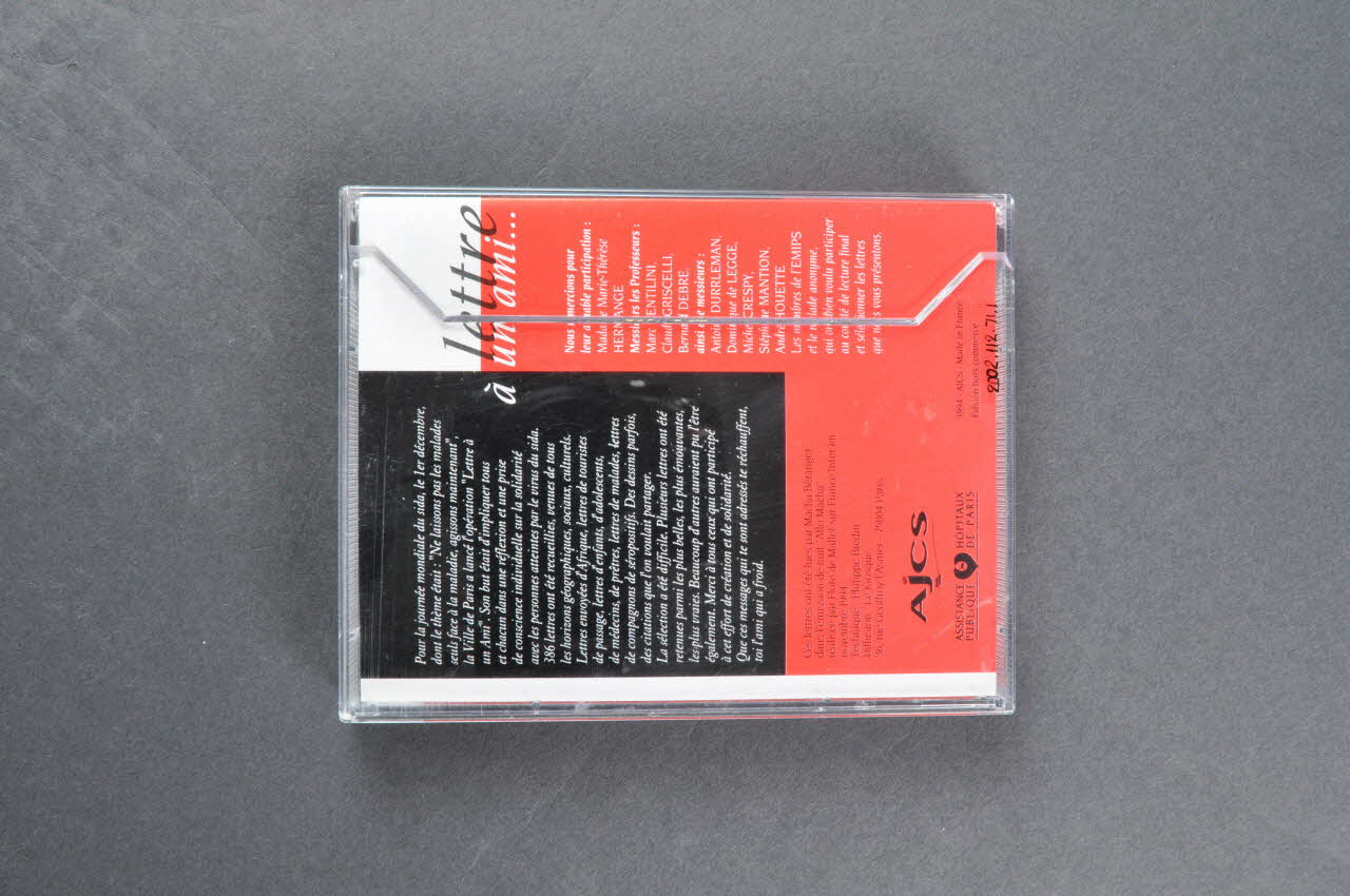 Sonate pour arpegione et piano en la mineur D 821 de Schubert. Violon :Régis Pasquier, Alto : Bruno Pasquier, Violoncelle : Roland Pidoux, Piano Jean-Claude Pennetier.Pour la journée mondiale du sida, le 1er décembre, dont le thème était :"Ne laissons pas les malades seuls face à la maladie, agissons maintenant.", la ville de Paris a lancé l'opération "Lettre à un ami". Son but était d'impliquer tous et chacun dans une réflexion et une prise de conscience individuelle sur la solidarité avec les personnes atteintes par le virus du sida. 386 lettres ont été recueillies, venues de tous les horions géographiques, sociaux, culturels. Lettres envoyées d'Afrique, lettres de touristes de passage, lettres d'enfants, d'adolescents, de médecins, de prêtres, lettres de malades, lettres de compagnons de séropositifs. des dessins parfois, des citations que l'on voulait partager. La sélection a été difficile. Plusieurs lettres ont été retenues parmi les plus belles, les plus émouvantes, les plus vraies. Beaucoup d'autres auraient pu l'être également. Merci à tous ceux qui ont participé à cet effort de création et de solidarité. Que ces messages qui te sont adressés te réchauffent, toi l'ami qui a froid., versoJ'aimerais pouvoir écrise des belles phrases, // Publier des grandes idées, des grandes philosophies. // je te dirais que c'est beau. // Je te donnerais un peu d'espoir. // Tu aurais peut être même envie de me connaître. // Mais rien ne vient. // Je n'ai rien d'un philosophe ni même d'un poète. // J'en suis encore à avoir peur de faire des fautes d'orthographe // Et pourtant il faut que je te crie que je suis à tes côtés. // Je pense à toi. // Juste pour que tu ne te sentes pas seul. // Pour te battre ou pour t'endormir dans la lumière. // Adrien.Certes j'étais si loin de vous, épargnée dans mon lit, // Mais la maladie me l'a pris, // C'est à mon tour de mourir sans lui. // Alors vous pouve toujours dédaigner mon sourire // Je n'ai rien d'autre à offrir. // CarolineSida. Ne laissons pas les malades seuls face à la maladie, sur la couvertureAmi, cher ami, mon cher ami, // Le front aux vitres, comme font les veilleurs de chagrin, // Je te cherche au delà de l'attente, // Au delà de moi-même. // Et je ne sais plus tant je t'aime // lequel de nous deux est absent. // Paul EluardCes lettres ont été lues par Macha Béranger dans l'émission de nuit "Allo Macha" réalisée par Flore de Mallet sur France Inter en novembre 1994. Technique Philippe Bredin. Diffusion Le Kiosque., versoTous droits du producteur phonographique et du propriétaire de l'oeuvre enregistrée réservés : duplication, diffusion publique radiophonique de cette bande interditesNous remercions pour leur aimable participation : Mme Marie-Thérèse Hermange, Messieurs les Professeurs Marc Gentilini, Claude Griscelli, Bernard Debré ainsi que messieurs Antoine Durrleman, Dominique de Legge, Michel Crespy, Stéphane Mantion, André Houette, les membres de l'EMIPS et le malade anonyme qui ont bien voulu participer au comité de lecture final et sélectionner les lettres que nous vous présentons., versoTitre, auteur