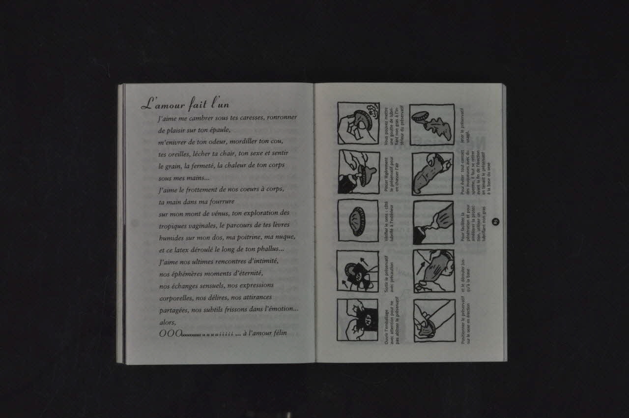 - p.81 Fond noir, sur toute la page, en gros caractères blancs :"Souvent la femme parle du préservatif alors que c'est un objet masculin"