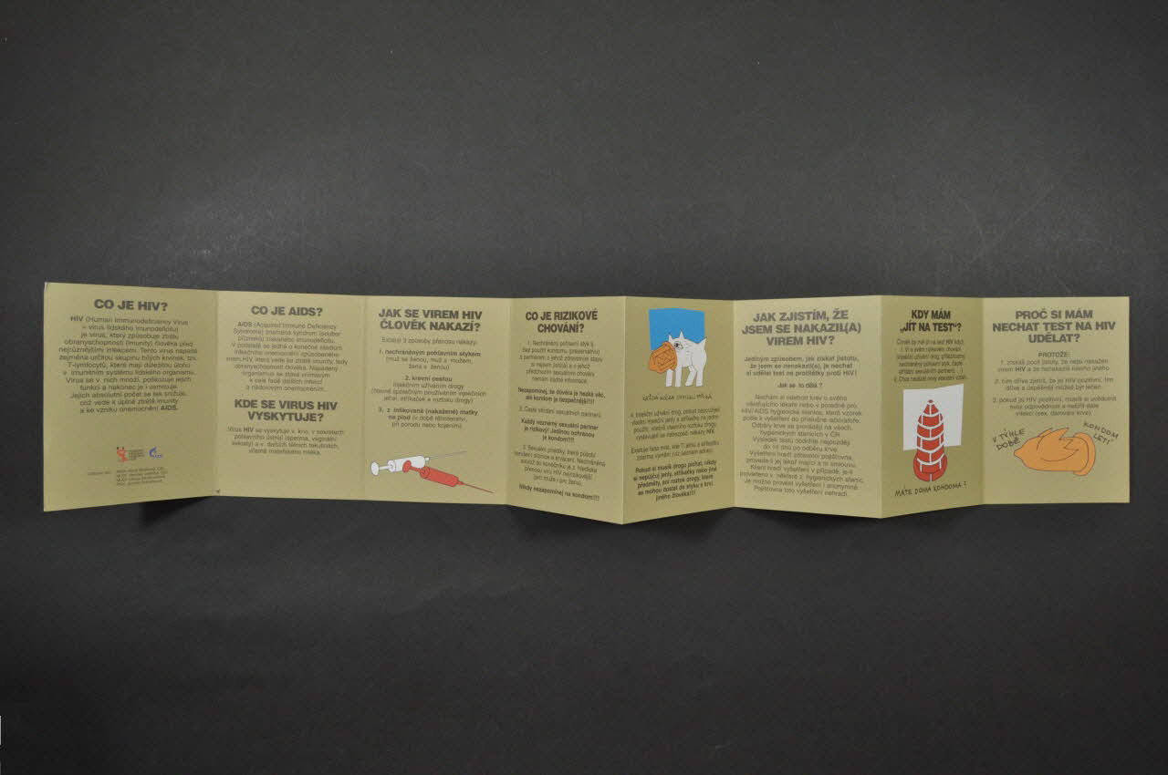 Navrhla: Kristina Fiserová, typo GIA STUDIO // Vytiski: A.R. GARAMOND s.r0o. // Vydal: SZÜ, Pracoviste manazera Národniho programu HIV/AIDS // http://www.aids-hiv.cz // Financováno z dotace Národnim programem boje proti AIDS // v r.2002 (Imprimée en petits caractères noirs en bas du verso), versoDécor