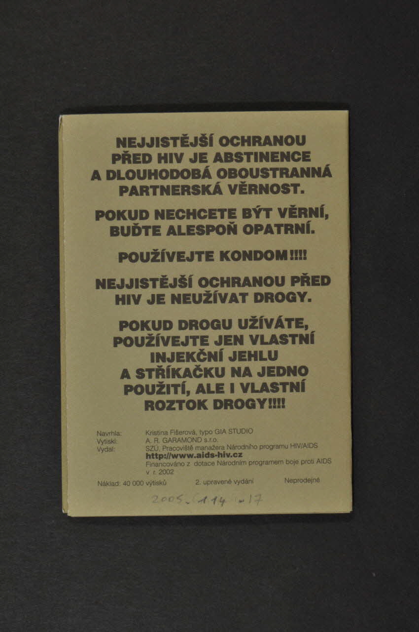 NEJJISTAJSI OCHRANOU // PRED HIV JE ABSTINENCE // A DLOUHODOBA OBOUSTRANNA // PARTNERSKA VÉRNOST. // // POKUD NECHCETE BYT VERNI, // BUDTE ALESPON OPATRNI. // // POUZIVEJTE KODOM!!!! // // NEJJISTEJSI OCHRANOU PRED // HIV JE NEUZIVAT DROGY. // // POKUD DROGU UZIVATE, // POUZIVETJTE JEN VLASTNI // INJEKCNI JEHLU // A STRIKACKU NA JEDNO // POUZITI, ALE I VLASTNI // ROZTOK DROGY!!!! (Imprimé en lettres capitales noires), versoAuteur