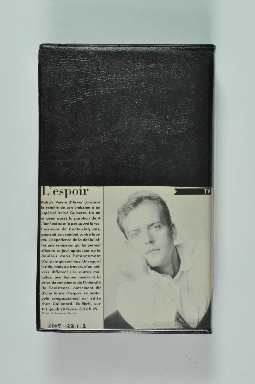 La cassette est en plastique noir, avec un autocollant sur le devant et un sur la tranche inférieure, sur lesquels sont présentes des inscriptions manuscrites en rapport avec l'enregistrement. Les coupures sont deux articles annonçant l'émission enregistrée. Ils sont tous deux illustrés d'une photographie de l'invité, en couleur pour la coupure du recto et en noir et blanc pour la seconde. Emission télévisée enregistrée sur cassette. Noir et blanc. Hervé Guibert seut devant PPDA, amaigri mais souriant, avec son fameux chapeau sur la tête. - explication de ce qu'est un protocole et de l'administration compassionnelle d'un traitement, de l'impatience des malades devant un traitement qui n'arrive pas, de la lenteur des essais thérapeutiques... - explication de ce qu'est l'AZT, et la DDI, comment ils agissent , coment il retrouve ses forces avec la DDI - description de l'atteinte de la maladie sur le corps : "tous les jours je perdais un segment d'un mouvement" ."J'avais atteint le découragement absolu". "Pas écrit pendant un an" - Relation avec le médecin passant par le corps, le toucher - Rôle thérapeutique de l'écriture : faire autre chose que se coucher, en travaillant j'oublie ma fatigue - L'importance des autres : "Il y a eu les lettres de mes lecteurs", la "mobilisation des amis" - Rapport complexe aux autres : on n'aime pas être pris pour un malade - Rapport complexe à ses parents, rapport possessif quand ils ont su qu'il était malade - Exclusion au quotidien : "Une femme de ménage n'a pas voulu travailler chez moi..." - Nier la maladie / Décision de la révéler par l'écriture - Rapport à la mort, déjà dans les livres avant le sida : côté prémonitoire de "la mort propagande" - Foucault - La photo : photo et mortInscriptions