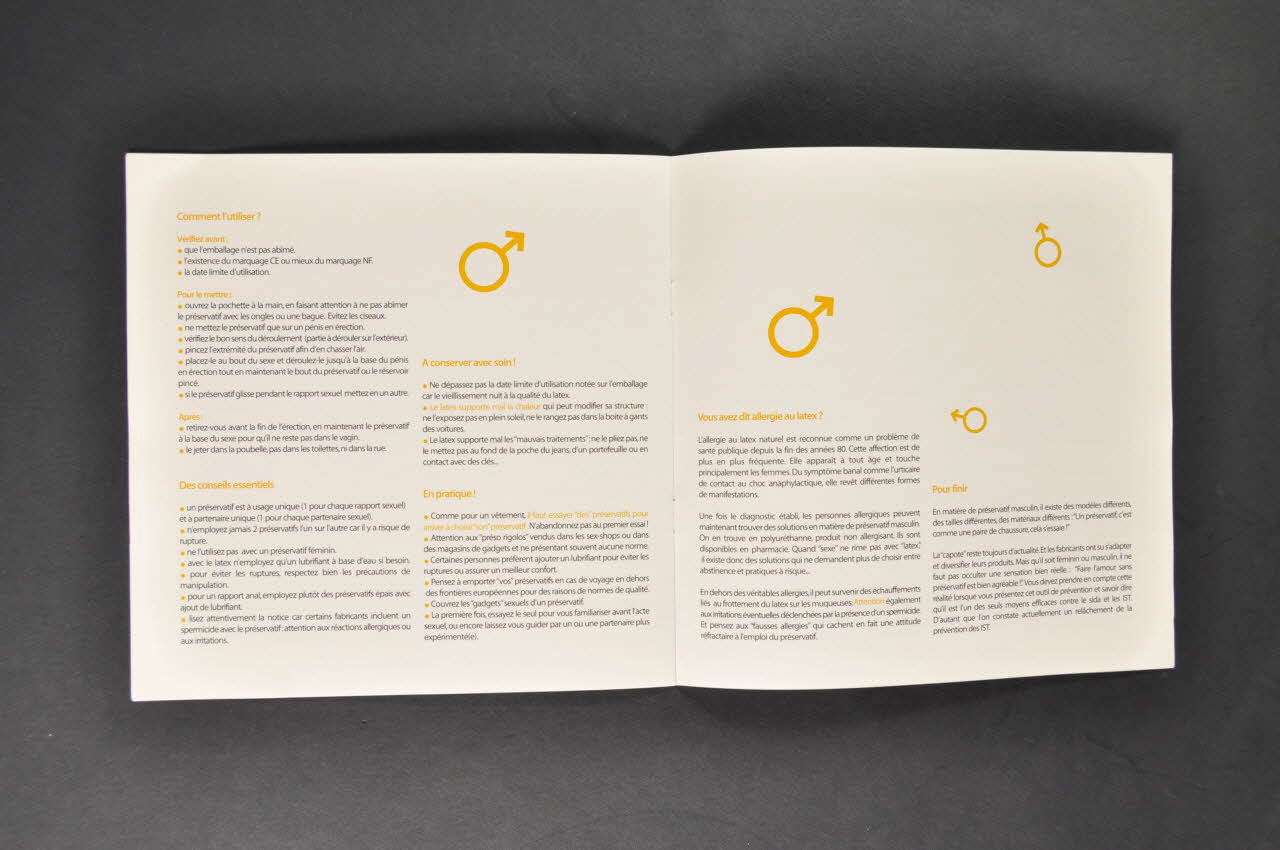 La première de couverture est illustrée de préservatifs jaunes et un transparent déroulé qui sont accompagnés du signe symbolisant le sexe masculin, formé d'un cercle et d'une flèche. Les bords gauche et supérieur sont rose. Le titre, en caractères blancs et rose, est marqué dans la partie supérieure gauche. La quatrième de couverture présente les divers collaborateurs, imprimés en caractères rose, suivis de trois logos dans la partie inférieure. A l'intérieur, les textes sont marqués en caractères rose, jaunes, verts ou noirs et les fonds sont rose, beiges ou blancs. Pour la partie imprimée en rose, on trouve le signe symbolisant le sexe féminin, en revanche pour la partie beige, les signes sont ceux symbolisant le sexe masculin.Inscriptions