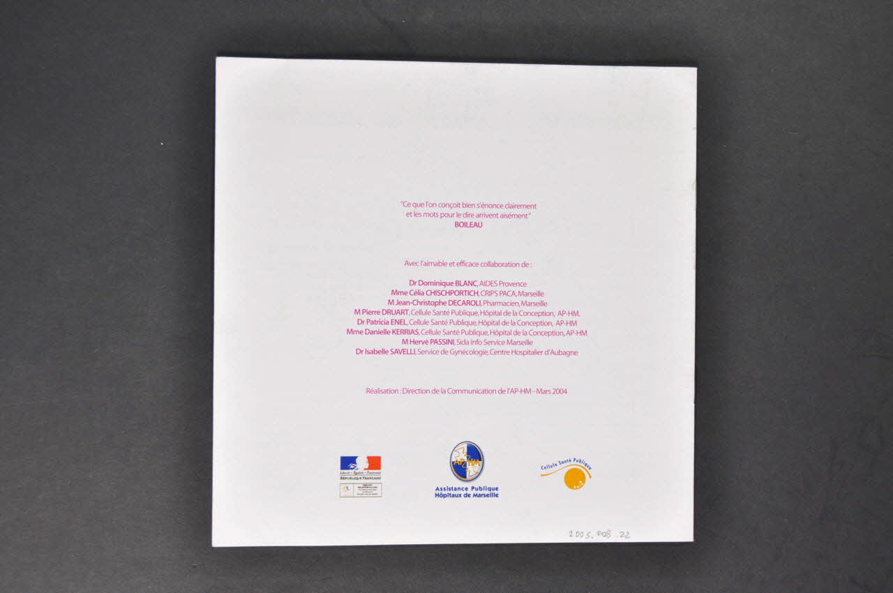 Réalisation: Direction de la Communication de l'AP-HM - Mars 2004 (L'inscription, en caractères rose, figure dans la partie inférieure de la quatrième de couverture.), sur la couvertureSommaire