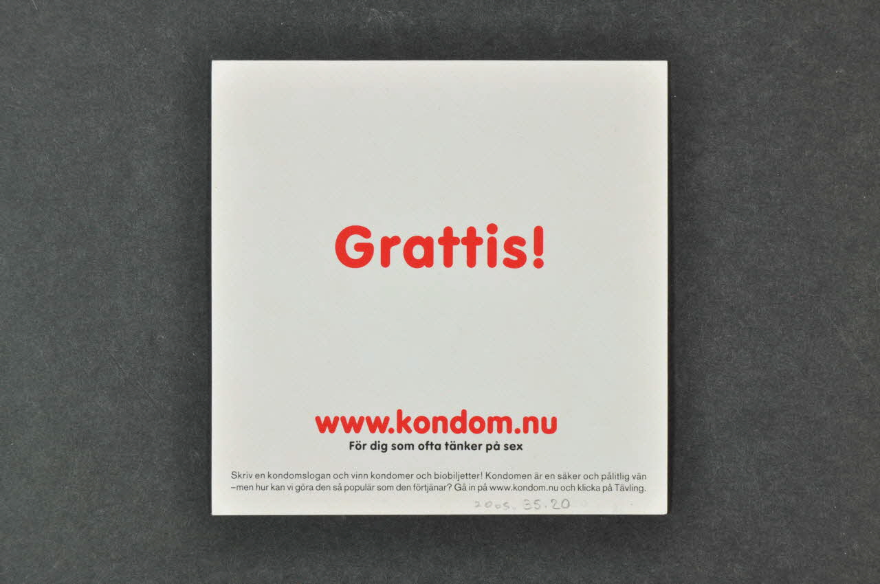 Skriv en kondomslogan och vinn kondomer och biobiljetter ! Kondomen är en säker och pålitlig vänmen hur kan vi göra den så populär som den förtjänar ? Gå in på www.kondom.nu och klicka på Tävling. (Imprimé en petits caractères noirs le long de la bordure inférieure.), versoGrattis ! (Imprimé en rouge au centre du verso), versoAdresse, texte