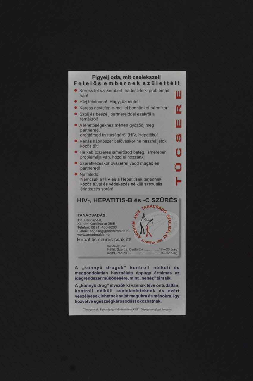 ANONIM HIV- és HEPATITIS SZÜRES ! (En capitales bleues verticalement), rectoHIV-, HEPATITIS-B és -C SZÜRES (Imprimé en noir dans l'encadré de la partie inférieure), versoAdresse