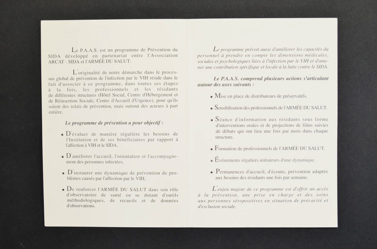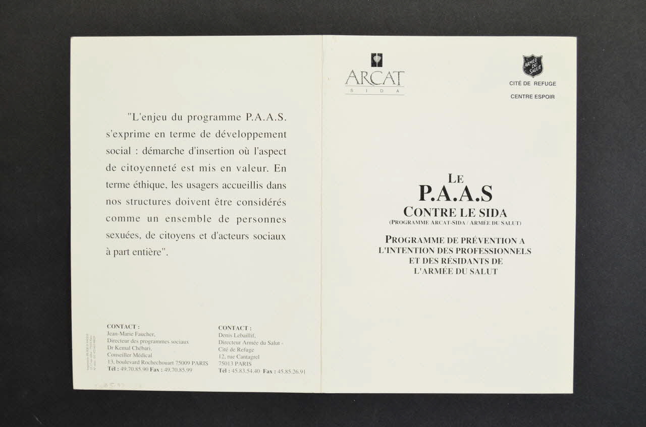 Dépliant, "Le P.A.A.S contre le sida (Programme de prévention à l'intention des professionnels et des résidants de l'Armée du Salut)"