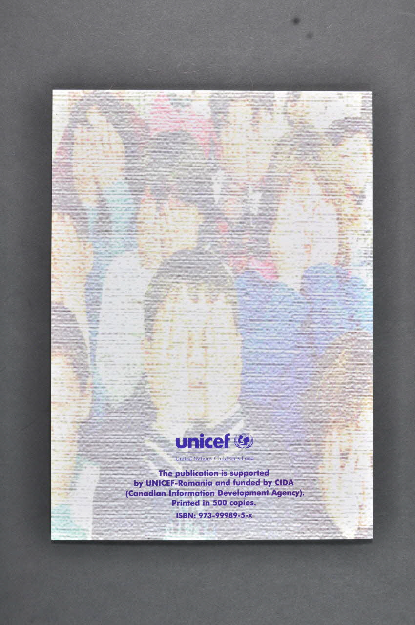 The publication is supported // by UNICEF-Romania and funded by CIDA // (Canadian Information Developement Agency) // Printed in 500 copies. (de la quatrième de couverture, en violet), en basNom d'association, logo