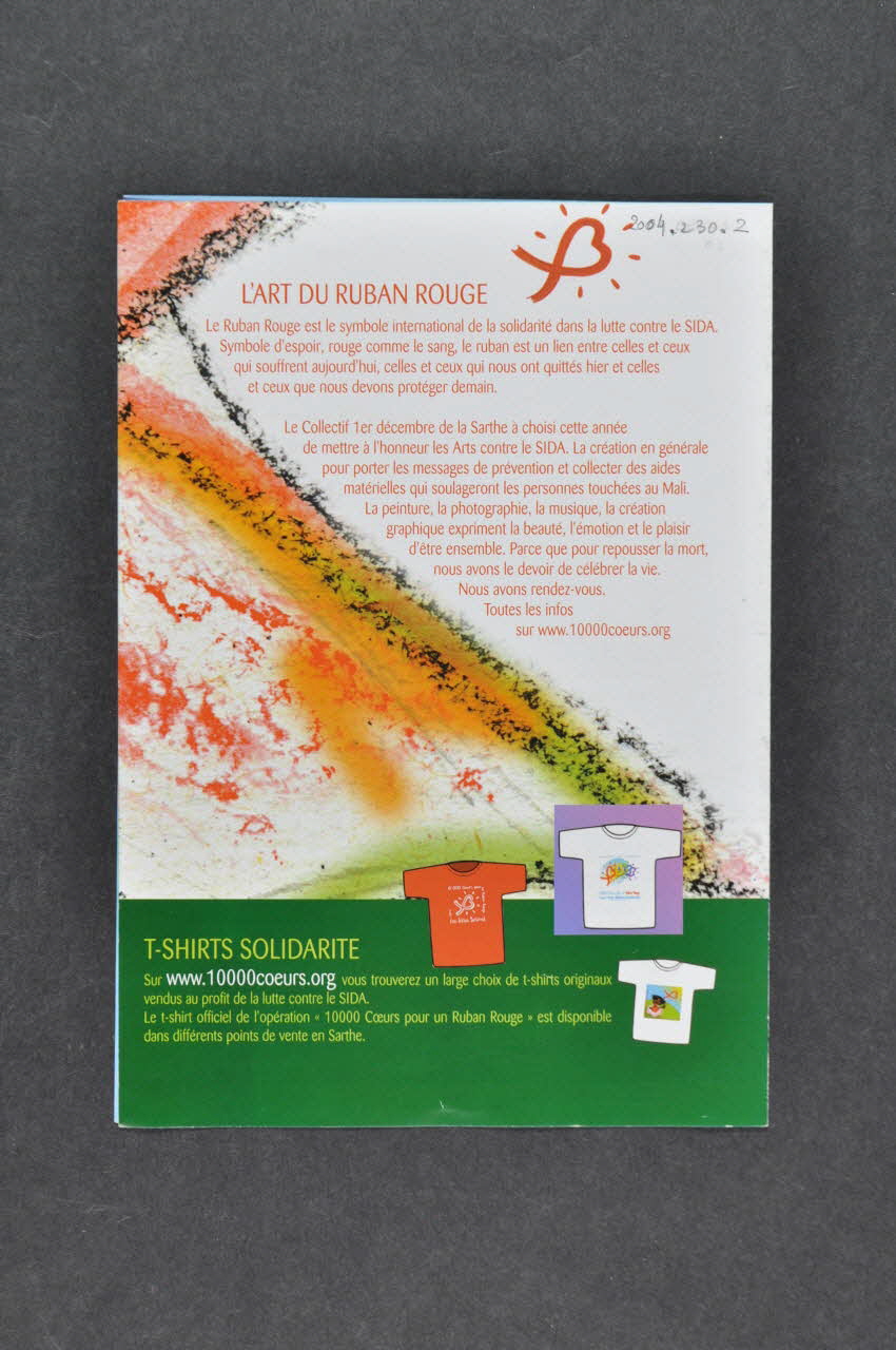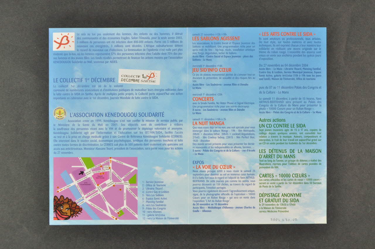 Le dépliant est en couleur et est écrit en français. Au recto, en haut à gauche, se trouve un triangle vert avec une adresse internet. En dessous, faisant la moitié de la surface de la couverture, il y a un dessin d'enfant. Il représente, au centre, un ruban rouge en forme de coeur. A l'intérieur du coeur, le ciel est bleu et il y a la tête d'une enfant africaine tenant une pancarte blanche sur laquelle est marquée le logo du collectif. En bas du dessin, se trouvent quatre bandeaux verts et jaunes, un peu en biais avec des inscriptions en capitales vertes. En dessous sur le fond vert, en jaune et vert, est marqué le programme, qui est repris à l'intérieur. A l'intérieur, à droite, sur un fond bleu ciel, on trouve un texte en trois paragraphes. Sous le texte, il y a un plan de rues et sa légende. A gauche, sur le même fond bleu ciel, dix petits paragraphes. Ils sont placés en colonne les uns en dessous des autres. Six sont écrits en bleu avec le titre en rouge et quatre sont écrits en vert. Au verso, à gauche, est représenté un des pans du ruban. En caractères rouges, il y a un texte et son titre, accompagné à droite d'un ruban rouge en forme de coeur. En bas, sur un bandeau vert, une publicité pour la vente de T shirts en solidarité avec l'opération. Trois photos de T-shirts accompagnent le texte.Inscriptions