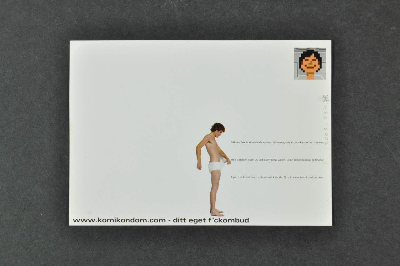 Säkrare Sex är att använda kondom vid samlag och att undvika sperma i munnen // Med kondom skall Du alltid använda vatten - eller silikonbaserat glidmedel // Tips om kondomer och annat kkan du fä pä www.komikondom.com. (à droite), versoAdresse