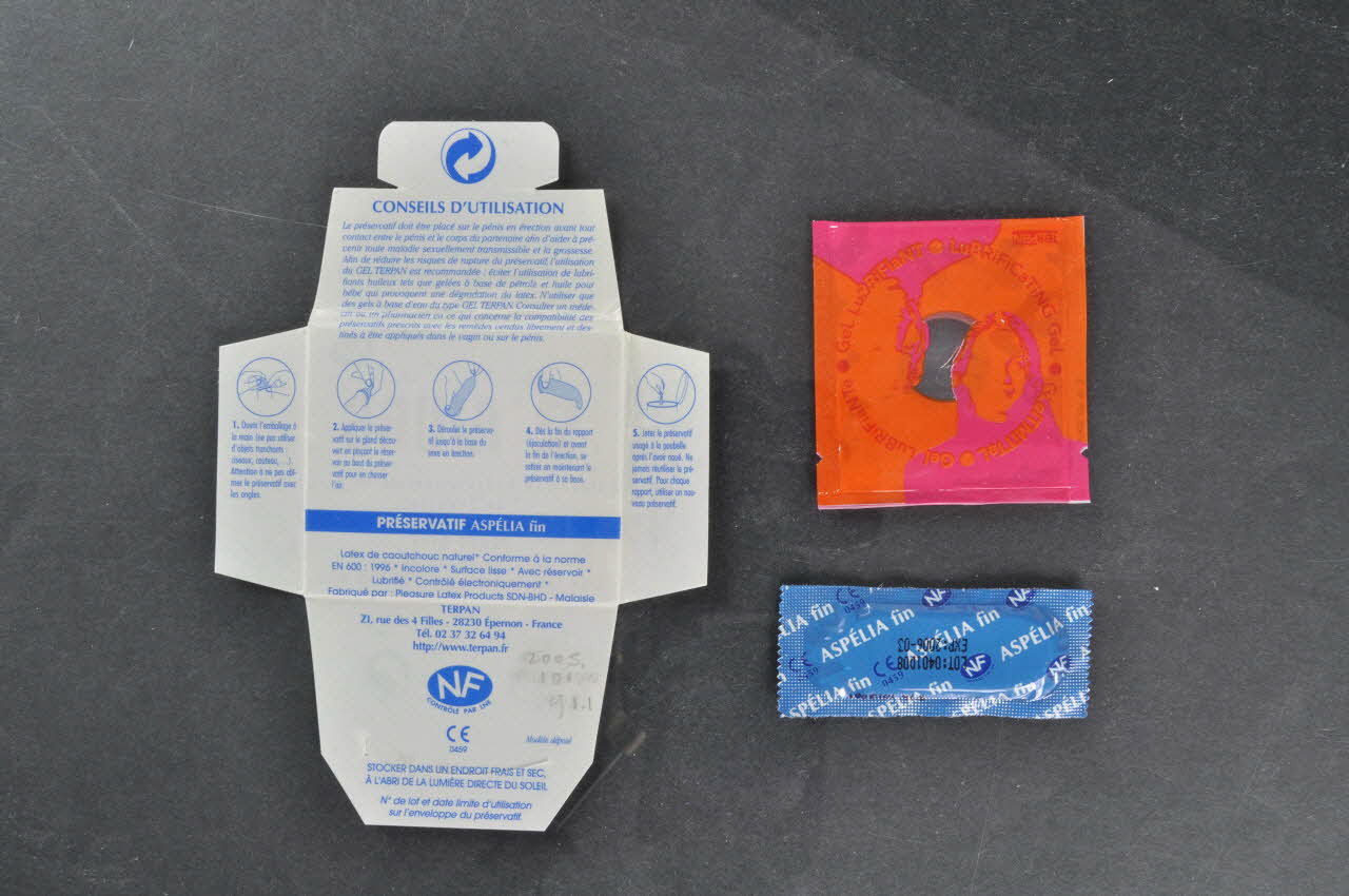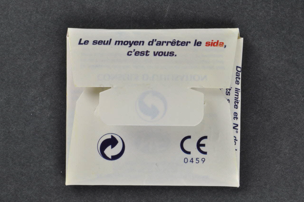 L'enveloppe est rangée dans une pochette carrée en carton blanc, se fermant par une languette s'insérant dans une encoche. La pochette est couverte d'inscriptions. Sur l'avant, le logo de Aides surmonte l'adresse de l'associaiton à Nice. Au dos on trouve des slogans. A l'intérieur sont imprimés des conseils d'utilisation et cinq schémas en caractères bleus. Une pochette en plastique translucide rose et orange, carrée, contenant du lubrifiant est également conservée dans la pochette en carton.Inscriptions